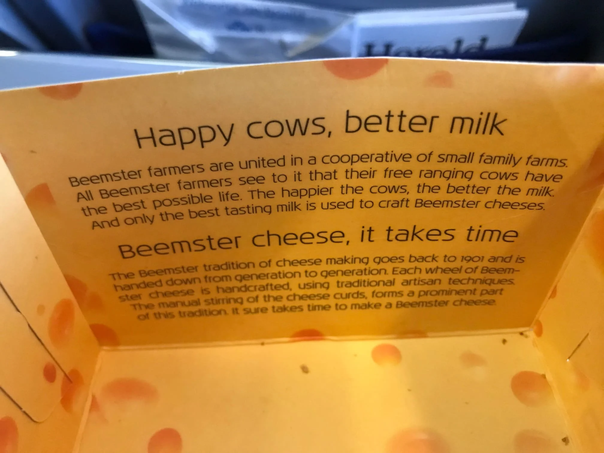 ด้านในอีกด้านของกล่องยังเสริมด้วยว่า วัวที่มีความสุขจะให้นมคุณภาพดีกว่า โดยเน้นว่าเกษตรกรโคนมแห่งบีมสเตอร์ดำเนินการในรูปแบบสหกรณ์ขนาดเล็กซึ่งปล่อยให้วัวออกหากินอย่างอิสระ ส่วนวิธีการผลิตชีสก็ยังเป็นวิธีดั้งเดิมที่แทบจะเป็นงานฝีมือของชาวบีมสเตอร์มากว่าหนึ่งศตวรรษ