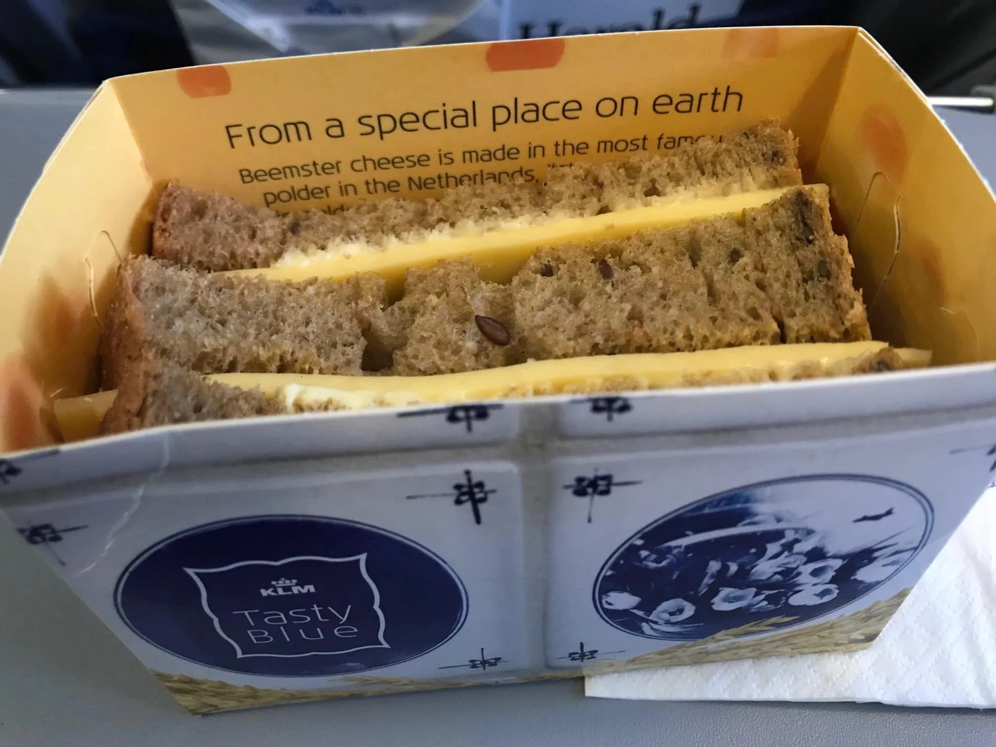 แซนวิชชีสสองชิ้นขนาดกะทัดรัดถูกบรรจุมาในกล่องกระดาษ เรียบง่ายสื่อถึงเอกลักษณ์ความเป็นดัตช์อย่างชัดเจนด้วยลวดลายสีฟ้าขาว มีรูปดอกทิวลิปและรองเท้าไม้ พร้อมชื่อยี่ห้อ Tasty Blue ด้านข้างโฆษณาอย่างเว่อร์วังว่า “ที่ KLM เราเสิร์ฟอาหารที่ได้รับการเตรียมอย่างพิถีพิถัน ซึ่งหมายความว่าเราเลือกใช้วัตถุดิบและส่วนผสมต่างๆ อย่างรับผิดชอบ เพื่อให้แน่ใจว่าคุณจะรับประทานแซนวิชของเราอย่างเอร็ดอร่อยด้วยรอยยิ้ม”