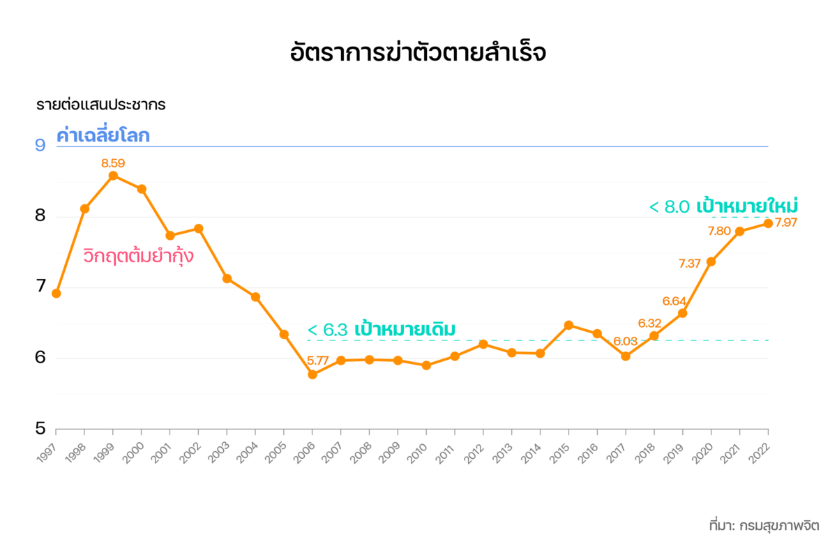 สถิติผู้มีความเสี่ยงซึมเศร้าจากเว็บไซต์ของกรมสุขภาพจิตเป็นชุดข้อมูลที่ดีที่สุดเท่าที่มีในปัจจุบันสำหรับการตรวจเช็กสุขภาพใจเบื้องต้นของคนไทย แต่แน่นอนว่ายังไม่ใช่ข้อมูลที่สะท้อนความเป็นจริงได้อย่างสมบูรณ์ เพราะจิตใจเป็นเรื่องละเอียดอ่อนที่อาจทอนลงเป็นตัวเลขได้ยาก และอาจยังมีผู้ที่เผชิญช่วงเวลายากลำบากอีกมากที่ไม่ได้หันมาพึ่งพาเครื่องมือชิ้นนี้ ช่องว่างของคนที่ไม่ได้ถูกนับในชุดข้อมูลนี้ปรากฏในสถิติอีกชุดหนึ่ง คืออัตราการฆ่าตัวตายสำเร็จของคนไทยซึ่งเพิ่มขึ้นต่อเนื่องติดต่อกันเป็นปีที่ 5 และอยู่ในระดับสูงสุดในรอบ 22 ปี[4] ใกล้เคียงกับในช่วงวิกฤตเศรษฐกิจ ‘ต้มยำกุ้ง’
