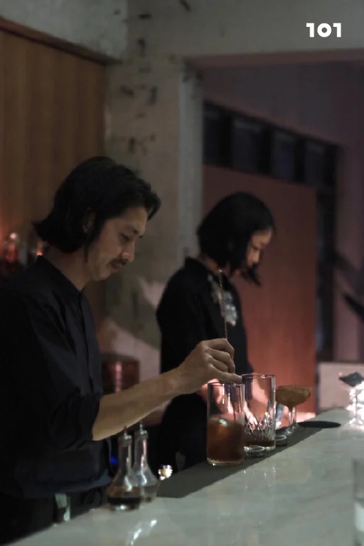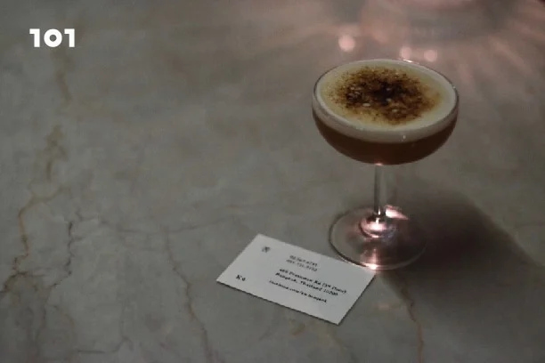 หญิงสาวหน้าหมวยลุคเฉี่ยวตามสมัยนิยมเสิร์ฟน้ำเปล่าให้เราพร้อมเมนูเครื่องดื่มที่เปลี่ยนไปไม่เหมือนกันในแต่ละเดือน จากที่กวาดสายตา ดูเหมือนค็อกเทลของบาร์นี้จะเน้นความเป็นตะวันออกจากส่วนผสมหลัก แต่ด้วยความที่ผมเองก็ไม่ใช่คนที่ลิ้นลุ่มลึกหรือรู้ดีเรื่องส่วนผสมอะไรมากมาย เลยตัดสินใจเลือกจากความ ‘ว้าว’ ของวัตถุดิบเป็นหลัก จนมาลงตัวที่ 10 herb (360 THB) ค็อกเทลที่มีเบสเป็นเหล้าจินผสมกับจับเลี้ยง ส่วนเพื่อนที่ต้องเตรียมไปบินเช้ามืดเลือกเป็น pandan (200 THB) ชาเขียวมัทฉะผสมใบเตยและน้ำตาลสดแบบไม่ผสมเหล้า