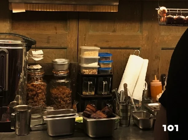 จะโดยตั้งใจหรือไม่ ก็ถือว่าที่นี่สอบผ่านในเรื่องของการสร้างบรรยากาศ หากพื้นที่ด้านนอกทำให้คุณขนหัวลุกกับความมืดสลัว การเปิดประตูเข้ามาด้านในแล้วพบกับต้นกล้วย กระดานไม้อัด ผนังและเพดานปูนเปลือยกระดำกระด่าง คราบเขม่าไฟนีออนที่ยังหลงเหลือ เมื่อมาอยู่คู่กับเคาน์เตอร์บาร์หินอ่อนยาวพร้อมเสียงเพลงแอมเบียนท์และกีตาร์สดจากดีเจอย่างสกอร์ในหนังอินดี้ซักเรื่อง ก็ทำให้บรรยากาศของ ‘ความเจ็บปวด’ ชัดเจนอย่างสมชื่อร้าน