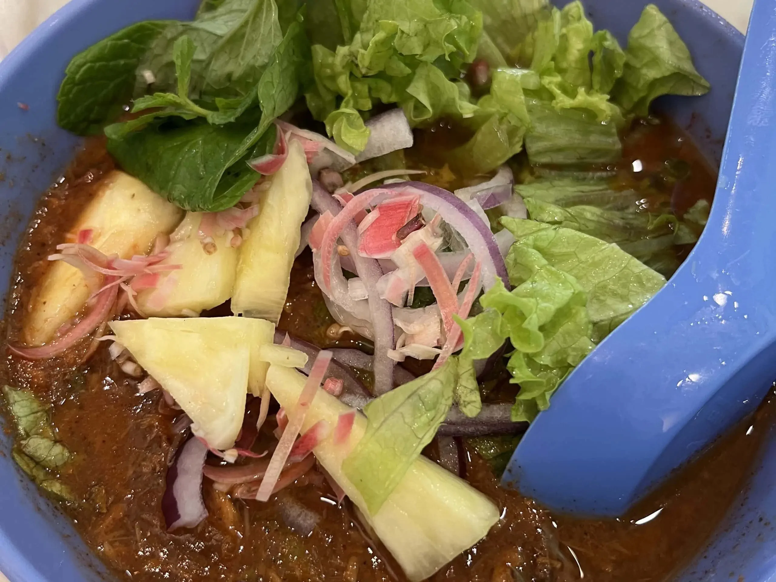 รอไม่นาน ลักซาสองชามก็วางลงตรงหน้าเรา น้ำแกงสีน้ำตาลแดง มีสับปะรดหั่น ใบสะระแหน่ หอมใหญ่หั่น ผักกาดหอม วางอยู่ด้านบนเส้น ส่วนเส้นก๋วยเตี๋ยวสีใสเหนียวหนึบดูดน้ำแกงเอาไว้กับตัวนอนอยู่ในถ้วย จังหวะซู้ดเส้นและซดน้ำทำให้นึกถึงรสชาติของแกงส้มผสมกับมะม่วงน้ำปลาหวาน เมื่อหาข้อมูลเพิ่มจึงรู้ว่า ‘ลักซาเกาะปีนัง’ เป็นหนึ่งในประเภทของลักซาเปรี้ยว ส่วนผสมหลักใช้ปลาแมกเคอเรล และได้ความเปรี้ยวมาจากมะขาม