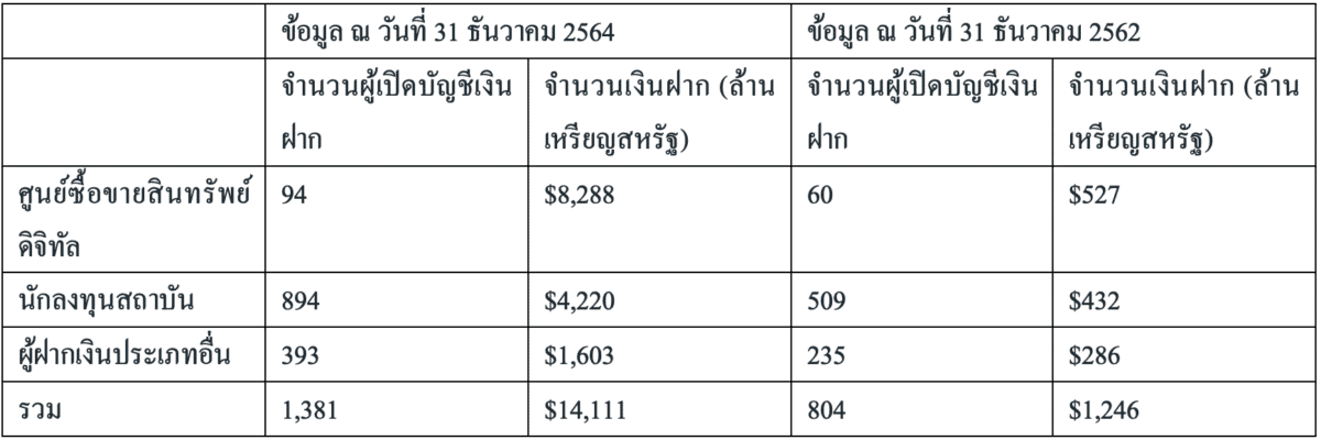 สัดส่วนลูกค้าผู้ฝากเงิน (depositors) ที่ประกอบธุรกิจเกี่ยวกับสินทรัพย์ดิจิทัลของ SB เพิ่มขึ้นอย่างมีนัยสำคัญในช่วงสามปีที่ผ่านมา ดังนี้
