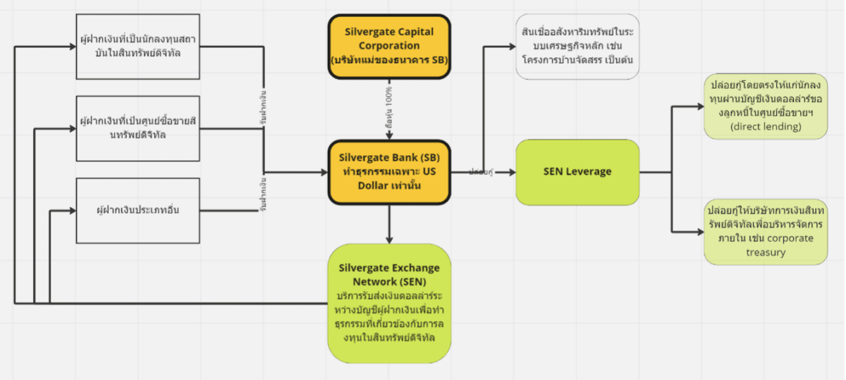 - Silvergate Exchange Network (SEN) เป็นเครือข่ายสำหรับลูกค้าของ SB ทำหน้าที่เป็นศูนย์ซื้อขายสินทรัพย์ดิจิทัลและนักลงทุนในสินทรัพย์ดิจิทัลที่ต้องการโอนเงินดอลลาร์สหรัฐระหว่างกัน โดยผู้โอนทั้งสองฝ่ายต้องมีบัญชีธนาคารกับ SB และมีหลักฐานว่ามีธุรกรรมระหว่างกัน ทั้งนี้ SB พัฒนาระบบ SEN โดยใช้เทคโนโลยี Cloud-based API และระบบ Online Banking ที่พัฒนาขึ้นเอง ทำให้สามารถส่งและรับเงินระหว่างกันได้ในทันที (instantaneous settlement) ตลอด 24 ชั่วโมงต่อวัน 7 วันต่อสัปดาห์