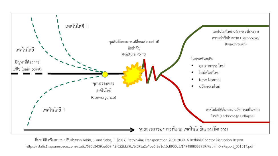 จากนั้นเมื่อถึงจุด rapture point การพัฒนาจากเทคโนโลยี หรืองานวิจัยต่างๆ ที่มาสังเคราะห์บูรณาการร่วมกันจึงจะนำไปสู่การเปลี่ยนแปลง การเปลี่ยนแปลงนี้ในช่วงแรกอาจมีวัฏจักรขึ้นลงในระยะแรก หรือที่เรียกว่าเป็นช่วงของการทดลองผิดลองถูก ซึ่งนั่นหมายความว่า วิสาหกิจขนาดกลางและขนาดเล็ก (SMEs) และหน่วยงานของประเทศที่มีเงินทุนจำกัดจะไม่สามารถแบกรับต้นทุนในระยะเวลาที่โครงการเหล่านี้ยังไม่สร้างกระแสเงินสดไหลเข้ามาได้ ดังนั้นจึงเป็นโอกาสให้ประเทศ และ/หรือ บริษัทที่มีเงินทุนสูงกว่าเข้ามาร่วมมือในรูปแบบต่างๆ ไม่ว่าจะเป็น Angel Investor, Venture Capital รวมทั้งการควบรวมหรือซื้อกิจการ ทั้งเพื่อนำไปต่อยอดการพัฒนาเทคโนโลยีและนวัตกรรมของตนเอง หรือแม้แต่การกำจัดคู่แข่งทางธุรกิจ เมื่อไม่ต้องการให้นวัตกรรมใหม่ๆ เกิดขึ้นมาเป็นคู่แข่ง