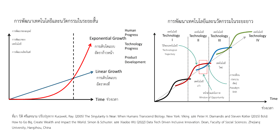 การพัฒนาองค์ความรู้ด้านวิทยาศาสตร์ เทคโนโลยี และนวัตกรรม ผ่านการวิจัยและความร่วมมือด้านอุดมศึกษามีลักษณะเฉพาะตัว การพัฒนานวัตกรรมจากห้องปฏิบัติการในสถาบันระดับอุดมศึกษา และ/หรือภาคเอกชน ไปจนถึงการเป็นนวัตกรรมใหม่ที่เข้าสู่ภาคธุรกิจ และตลาดที่ผู้บริโภคสามารถเข้าถึงมีลักษณะเป็นการขยายตัวแบบเอกซ์โพเนนเชียล (exponential) และต้องการความต่อเนื่อง ดังแสดงในแผนภาพ