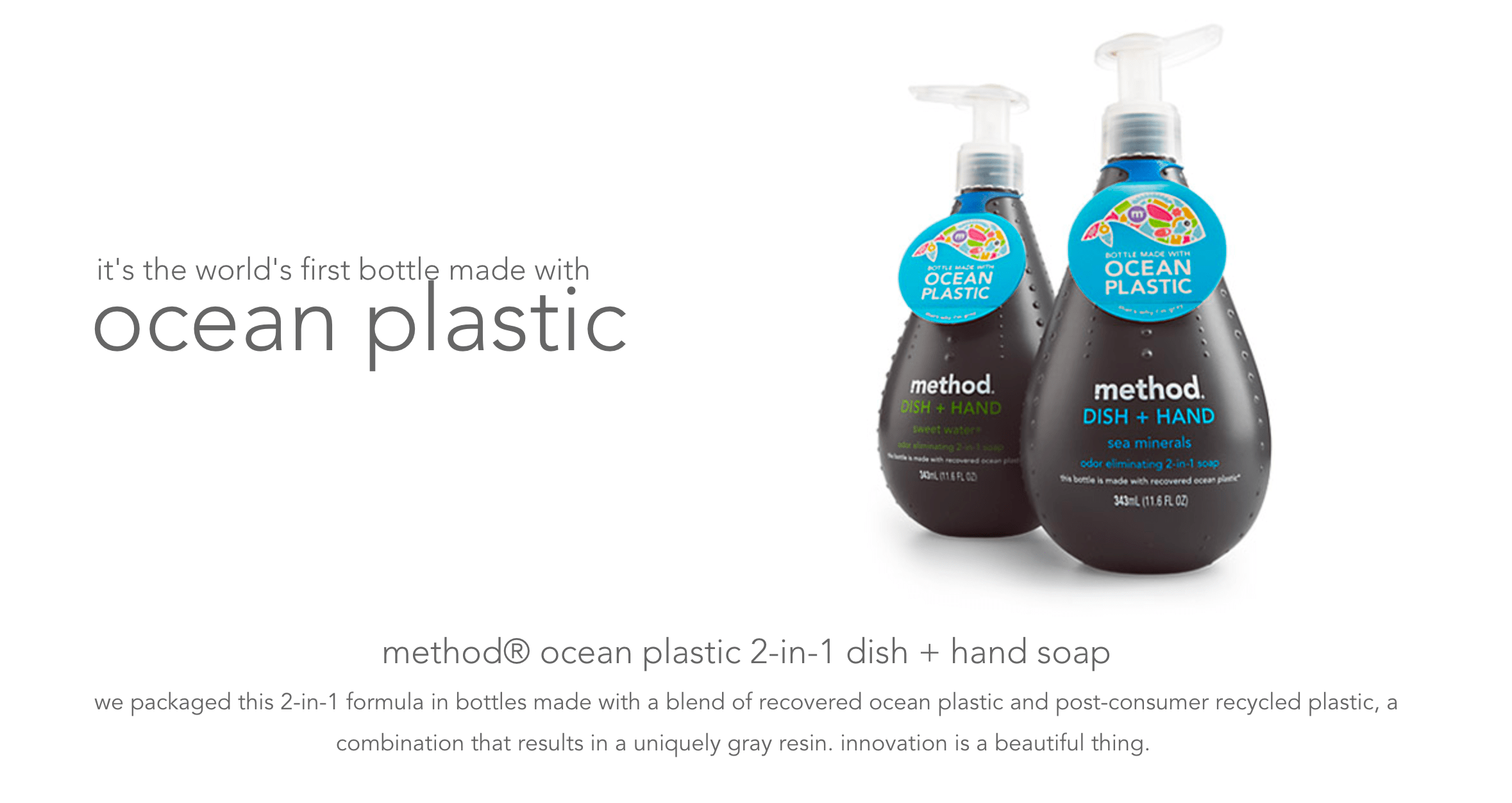 Method แบรนด์ผลิตภัณฑ์ทำความสะอาดที่เป็นมิตรต่อสิ่งแวดล้อมชื่อดังอีกแห่ง เริ่มพัฒนาการรีไซเคิลบรรจุภัณฑ์พลาสติกมาตั้งแต่ปี พ.ศ.2551 ในปัจจุบัน Method ใช้บรรจุภัณฑ์ที่ทำมาจากพลาสติกรีไซเคิลในหลายรายการ เช่น สบู่ล้างมือ สบู่ล้างจาน สเปรย์ทำความสะอาด น้ำยาทำความสะอาดห้องน้ำ และน้ำยาซักผ้า ยิ่งไปกว่านี้ บริษัทประสบความสำเร็จในการผลิตบรรจุภัณฑ์ที่ทำมาจากการรีไซเคิลขยะพลาสสติกในทะเล