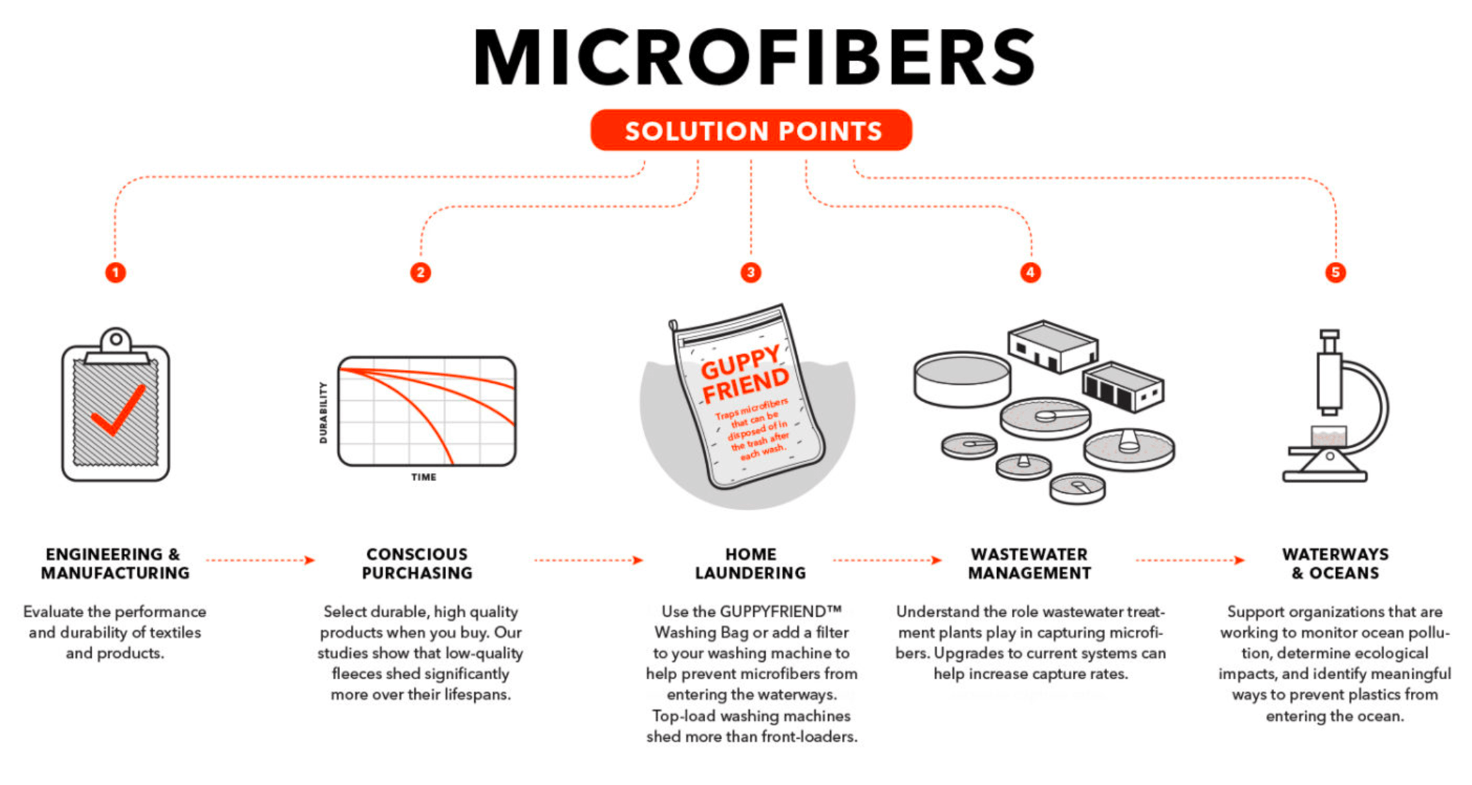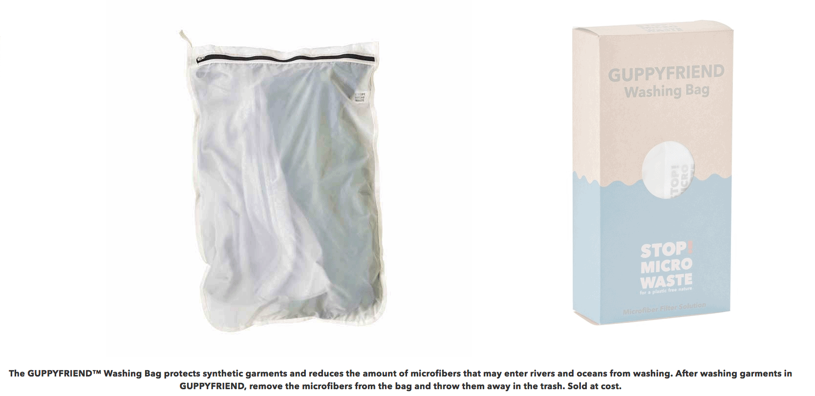 ข้ามมาที่ฝั่งอุตสหกรรมสิ่งทอและเสื้อผ้า ไม่มีบริษัทใดรุดหน้าไปกว่า Patagonia ซึ่งสนับสนุนการศึกษาวิจัย 2 โครงการ[3] เพื่อทำความเข้าใจไมโครไฟเบอร์ที่ปลดปล่อยออกมาจากเสื้อผ้าในขั้นตอนการทำความสะอาดและปนเปื้อนลงสู่สภาพแวดล้อม โดยหวังว่าจะพบวิธียับยั้งการปนเปื้อนดังกล่าว ขณะที่งานวิจัยยังดำเนินไป บริษัทได้ดำเนินมาตรการจำกัดผลกระทบโดยออกคำแนะนำต่อลูกค้าว่าไม่ควรซักเสื้อผ้าบ่อยนัก (เพื่อลดการปนเปื้อนไมโครไฟเบอร์ลงสู่ระบบน้ำทิ้งและปนเปื้อนสู่สภาพแวดล้อม) และจับมือกับ GuppyFriend จำหน่ายถุงซักผ้าที่ดักไมโครไฟเบอร์ไม่ให้ปนเปื้อนสู่ระบบบำบัดน้ำในขั้นตอนการซักเครื่องและซักมือ ที่สำคัญ Patagonia นำถุงซักผ้านี้มาขายในราคาทุนเท่านั้น
