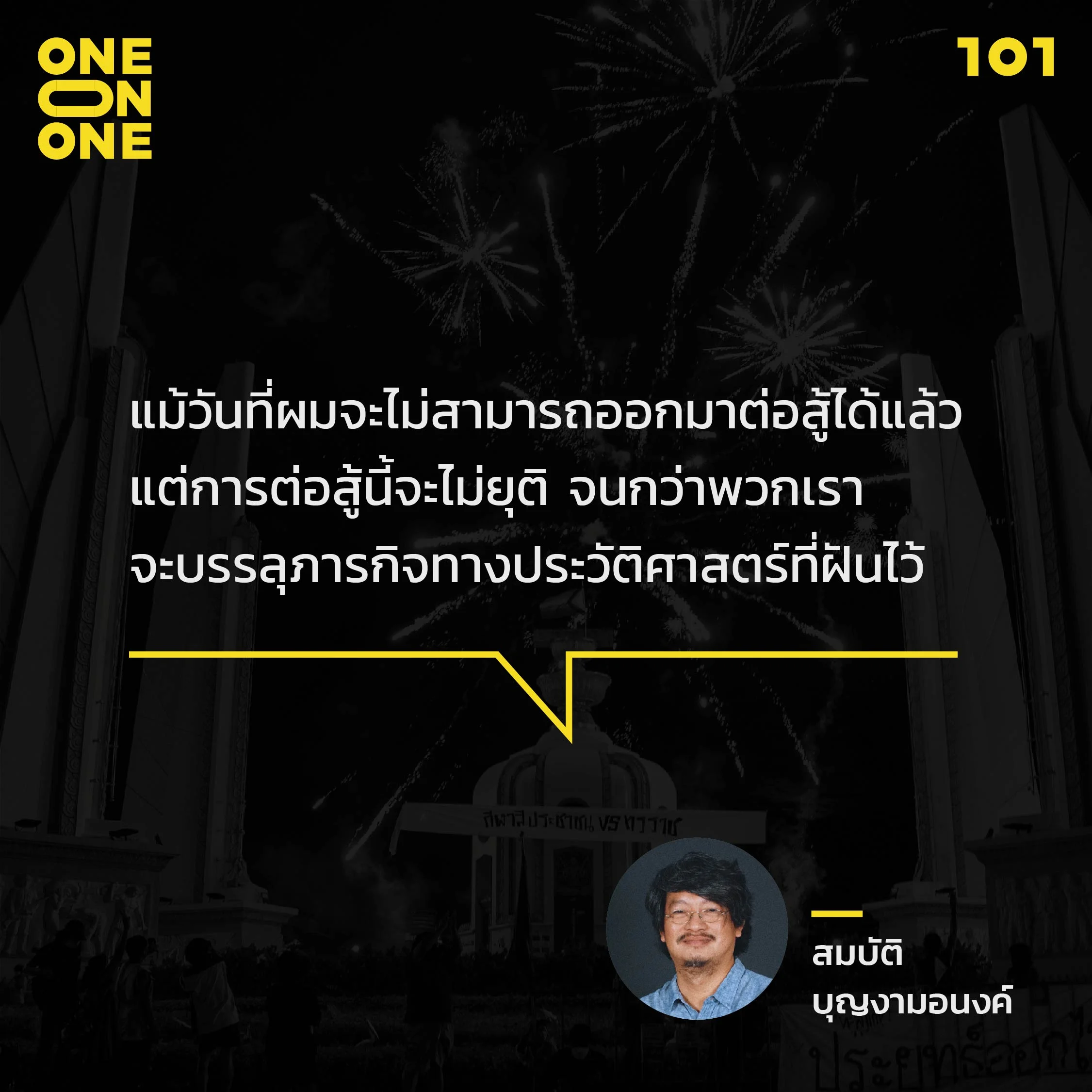 ผมเห็นวิวัฒนาการของสังคม เห็นความตื่นตัวของประชาชนในระดับที่ใหญ่มากและเชื่อว่าจะใหญ่กว่านี้ ผมเห็นคนที่เรียนรู้และข้ามฝั่งกลับมายืนกับประชาชนอย่างงดงาม ผมเห็นความงดงามของการที่เรายังยืนอยู่ตรงนี้เพื่อรอคอยมิตรสหายและผู้คนอีกจำนวนมากที่จะเดินข้ามเส้นกลับมายืนกับหลักประชาธิปไตย ขณะเดียวกัน ผมก็เห็นคนหนุ่มสาวที่มีกำลังวังชาและมีเวลาของชีวิตที่ยาวกว่าผมมากๆ ทั้งหมดนี้ทำให้ผมรู้ว่า ต่อให้ผมสู้เรื่องนี้ไปจนแก่ชราและอาจจะไม่สามารถออกมาต่อสู้ได้แล้ว แต่การต่อสู้นี้จะไม่ยุติจนกว่าพวกเราจะบรรลุภารกิจทางประวัติศาสตร์ที่ฝันไว้