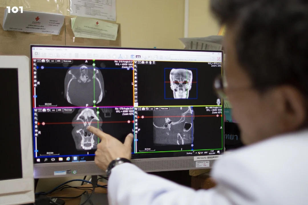 “ถ้าเราดูภาพจากเอกซเรย์คอมพิวเตอร์ คนปกติถ้าโพรงไซนัสไม่มีอะไรกีดขวางภาพต้องเป็นสีดำทั้งหมด อย่างเคสที่เห็นอยู่นี้ถือว่าเป็นขั้นรุนแรง สีดำไม่ค่อยมีแล้ว” รศ.นพ.ทรงกลด เอี่ยมจตุรภัทร อาจารย์ภาควิชาโสต ศอ นาสิกวิทยา คณะแพทยศาสตร์ จุฬาลงกรณ์มหาวิทยาลัย และหัวหน้าศูนย์ความเป็นเลิศทางการแพทย์ การผ่าตัดส่องกล้องโรคจมูกและไซนัส แห่งโรงพยาบาลจุฬาลงกรณ์ สภากาชาดไทย ไล่นิ้วไปตามฟิล์มเอกซเรย์พลางอธิบาย