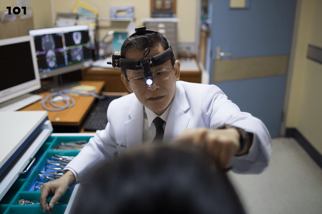 “ถ้าเราดูภาพจากเอกซเรย์คอมพิวเตอร์ คนปกติถ้าโพรงไซนัสไม่มีอะไรกีดขวางภาพต้องเป็นสีดำทั้งหมด อย่างเคสที่เห็นอยู่นี้ถือว่าเป็นขั้นรุนแรง สีดำไม่ค่อยมีแล้ว” รศ.นพ.ทรงกลด เอี่ยมจตุรภัทร อาจารย์ภาควิชาโสต ศอ นาสิกวิทยา คณะแพทยศาสตร์ จุฬาลงกรณ์มหาวิทยาลัย และหัวหน้าศูนย์ความเป็นเลิศทางการแพทย์ การผ่าตัดส่องกล้องโรคจมูกและไซนัส แห่งโรงพยาบาลจุฬาลงกรณ์ สภากาชาดไทย ไล่นิ้วไปตามฟิล์มเอกซเรย์พลางอธิบาย