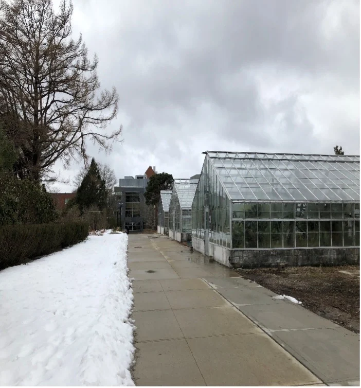 โรงเรือนกระจกที่ไว้สำหรับปลูกพืชและสมุนไพรเขตร้อนสำหรับการศึกษาวิจัยทางเภสัชวิทยาของคณะเภสัชศาสตร์ในมหาวิทยาลัย ภาพนี้ได้ถ่ายไว้ในช่วงฤดูหนาวที่ปกคลุมไปด้วยหิมะ ภายในโรงเรือนมีพืชเขตร้อนหลากหลายชนิด ถือได้ว่าเป็นการลงทุนสูงด้านการวิจัยและพัฒนา เพราะต้นทุนการดูแลรักษารวมทั้งการควบคุมความชื้นและอุณหภูมิใช้งบประมาณสูงมาก แต่ก็ถือว่าคุ้มค่ากับการลงทุน บางครั้งภายในสถานที่แห่งนี้ก็เป็นที่ผักผ่อนหย่อนใจของผู้เขียนในช่วงฤดูหนาวมาเยือน นอกจากเป็นที่หลบภัยความหนาวเหน็บแล้ว ยังได้กลิ่นอายความเป็นเมืองร้อนชื้นและกลิ่นของพืชเมืองร้อนท่ามกลางความหนาวเย็นและหิมะปกคลุม รู้สึกเหมือนได้นั่งแคปซูลฝ่าพายุหิมะกลับไปพบปะอดีตแห่งเทือกเขาภูพานบ้านเกิด / ภาพโดยผู้เขียน