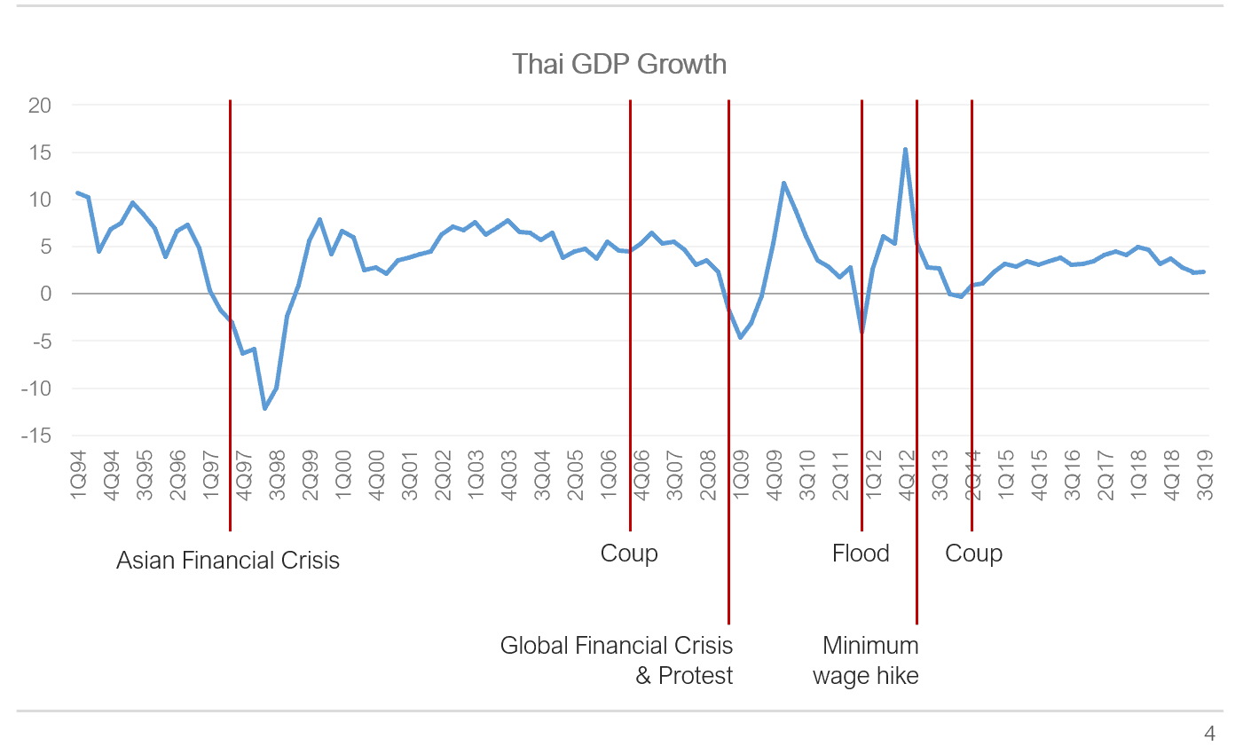 ประเด็นย่อยๆ เหล่านี้เมื่อรวมกันแล้วทำให้เกิดปัญหาใหญ่คือการเติบโตที่ช้าลงของเศรษฐกิจไทย เศรษฐกิจไทยเคยเติบโตได้เฉลี่ย 6-7% ในช่วงทศวรรษก่อนเกิดวิกฤตเศรษฐกิจต้มยำกุ้ง แต่ภายหลังวิกฤตใหญ่ครั้งนั้น เศรษฐกิจไทยเติบโตเฉลี่ย 4-5% ต่อปี และในระยะหลังมานี้ ประเทศไทยก็ยังต้องเผชิญปัญหาอีกหลายเรื่อง จนอัตราการเติบโตเฉลี่ยไม่ถึง 3% เศรษฐกิจไทยไม่เคยฟื้นตัวกลับไปสู่เส้นแนวโน้มการเติบโตเดิมได้ ประเด็นดังกล่าวเป็นเรื่องสำคัญ ด้วยอัตราการเติบโตของไทยที่ใกล้เคียงกับประเทศพัฒนาแล้วเช่นนี้ เราแทบจะไม่มีสิทธิไล่ตามพวกเขาทัน แต่เรากลับถูกประเทศอื่นจำนวนมากไล่หลังเราขึ้นมาอย่างรวดเร็ว