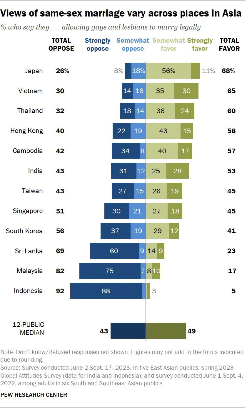 [12] Pew Research Center, “Across Asia, views of same-sex marriage vary widely”, Accessed January 15,2025. https://www.pewresearch.org/short-reads/2023/11/27/across-asia-views-of-same-sex-marriage-vary-widely/