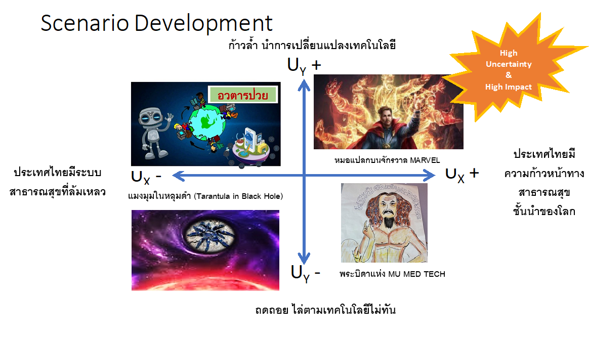 ฉากทัศน์สุดท้ายคือ ‘พระบิดาแห่ง MU MED TECH’ ซึ่งเป็นฉากทัศน์ที่ประเทศไทยสามารถรับมือกับโลกอุบัติใหม่ได้อย่างเข้มแข็ง หากแต่เกิดความงมงายอ่อนด้อยอย่างยิ่งในมิติวิทยาศาสตร์เทคโนโลยี