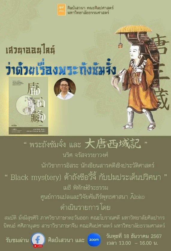 [9] ศิลป์เสวนา คณะศิลปะศาสตร์ มหาวิทยาลัยธรรมศาสตร์ หัวข้อ “ถังซัมจั๋ง และ ต้าถังซีอวี้จี้” วันที่ 18 ธันวาคม พ.ศ.2567 ดู https://www.facebook.com/watch/live/?ref=watch_permalink&v=1290455458760376
