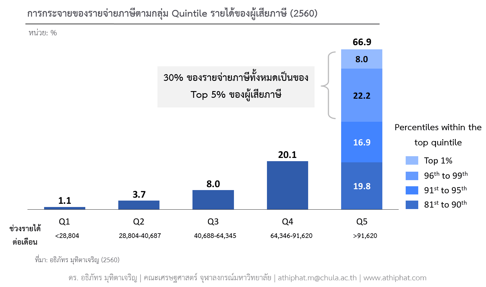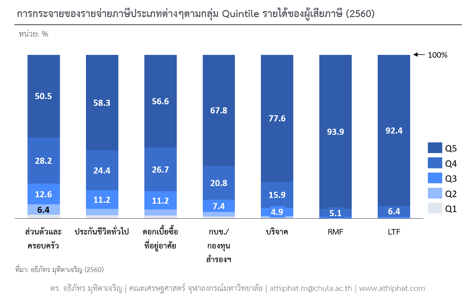 งานวิจัยของผมพบว่า กว่า 67% ของรายจ่ายภาษีเป็นของผู้เสียภาษีในกลุ่ม Quintile รายได้สูงสุด (Q5) และ 30% ของรายจ่ายภาษีทั้งหมดเป็นของผู้ที่มีรายได้สูงสุด Top 5% ส่วนหนึ่งของการกระจุกตัวนี้มาจากการที่ผู้มีรายได้สูงจะอยู่บนขั้นบันไดภาษีสูงกว่าผู้มีรายได้น้อย ทำให้การหักลดหย่อนหนึ่งบาทของผู้ที่มีรายได้สูงมีต้นทุนต่อรัฐสูงกว่าของผู้มีรายได้น้อย