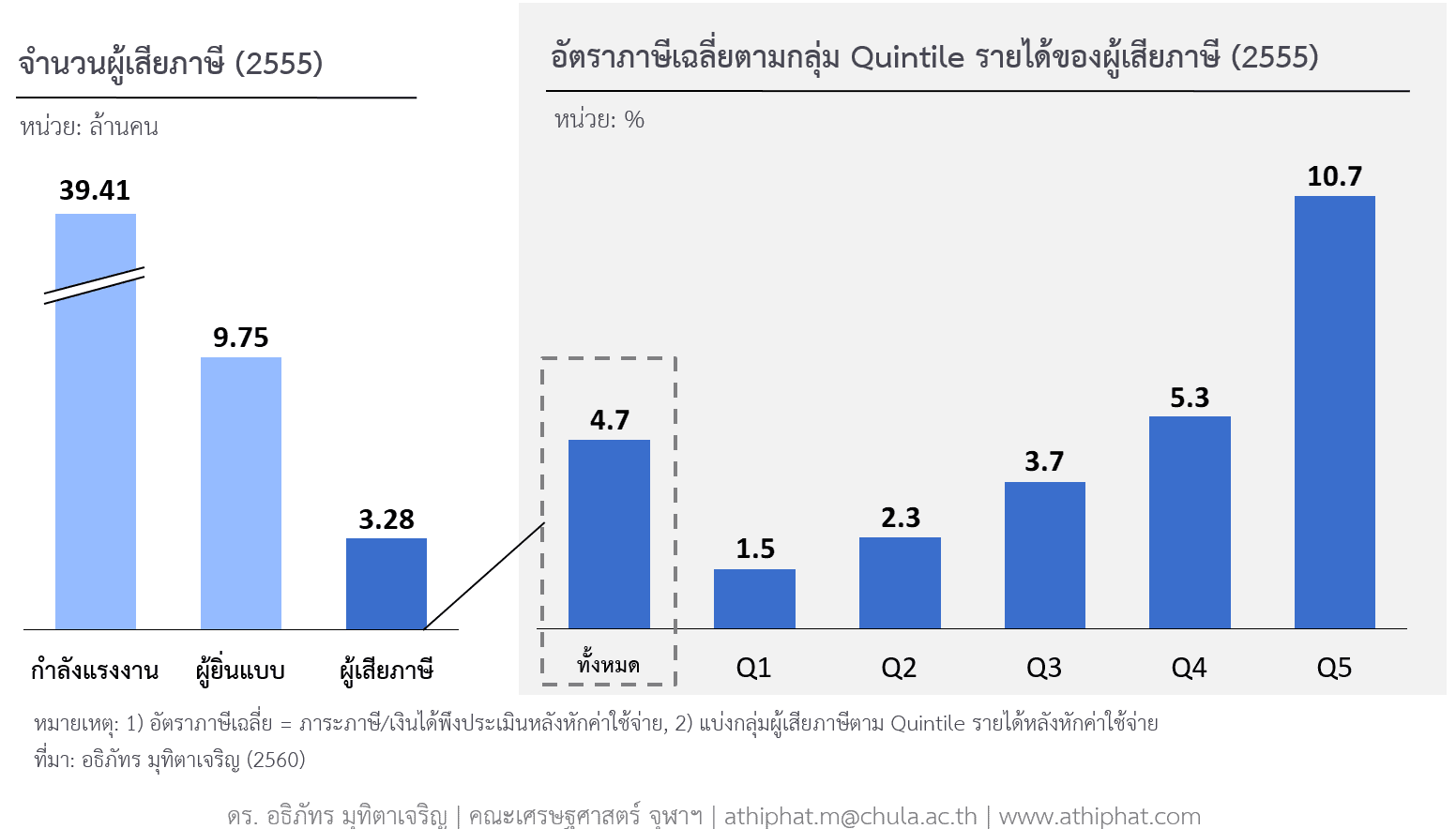 ถ้าเราแบ่งผู้เสียภาษีออกเป็น 5 กลุ่ม กลุ่มละเท่าๆ กัน จากระดับรายได้น้อยไปมาก (Quintile) โดยกลุ่ม Q1 คือกลุ่มที่มีรายได้น้อยที่สุด 20% ล่าง และกลุ่ม Q5 คือกลุ่มที่มีรายได้มากที่สุด 20% บน งานวิจัยของผมพบว่าอัตราภาษีเฉลี่ยของกลุ่ม Q1 อยู่ที่ 1.5% ส่วนกลุ่ม Q5 อยู่ที่ 10.7%