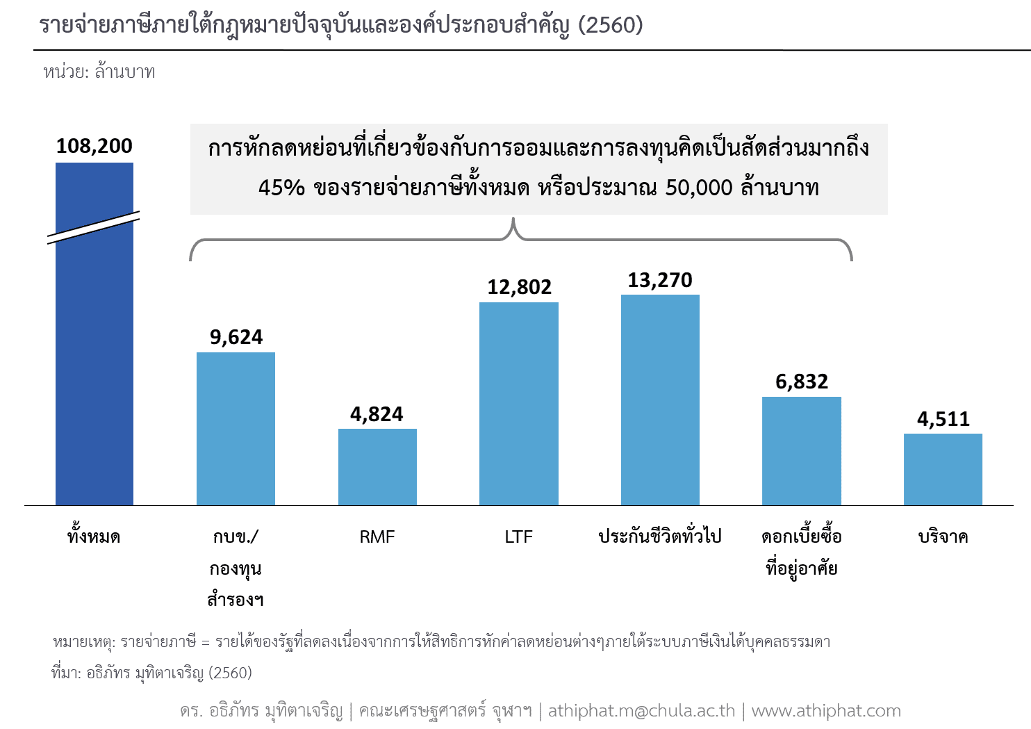 ผมสร้างแบบจำลอง Microsimulation โดยใช้ข้อมูลสุ่มของผู้เสียภาษีเงินได้บุคคลธรรมดาทั้งหมดในปี 2555 เพื่อประมาณการรายได้และภาระภาษีของประชาชนภายใต้กฎหมายภาษีปัจจุบัน พบว่า รายจ่ายภาษีรวมมีขนาดประมาณ 110,000 ล้านบาท หรือ 0.7% ของ GDP ในปี 2560 โดยองค์ประกอบที่น่าสนใจคือ การหักลดหย่อนที่เกี่ยวข้องกับการออมและการลงทุน รวมกันแล้วมีขนาดประมาณ 50,000 ล้านบาท คิดเป็นสัดส่วนสูงถึง 45% ของรายจ่ายภาษีทั้งหมด ตัวอย่างสำคัญของการหักลดหย่อนในหมวดนี้ คือ LTF RMF และประกันชีวิต