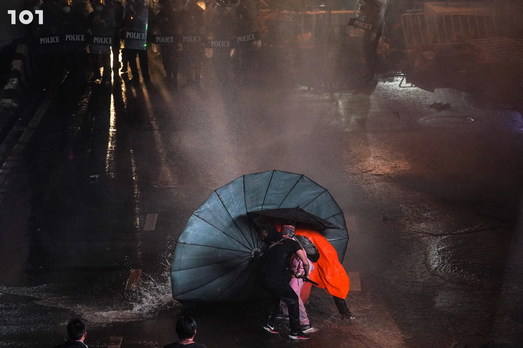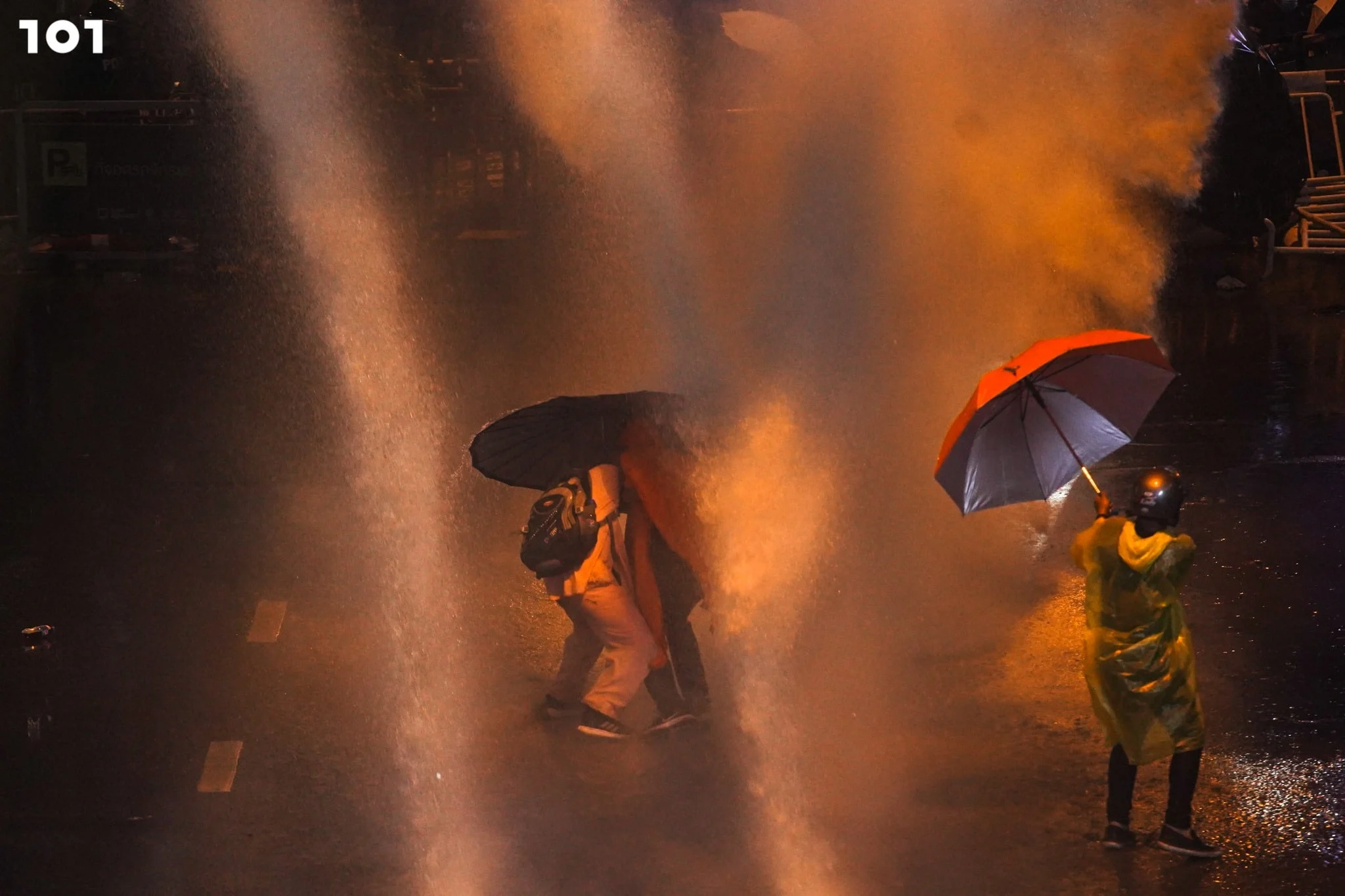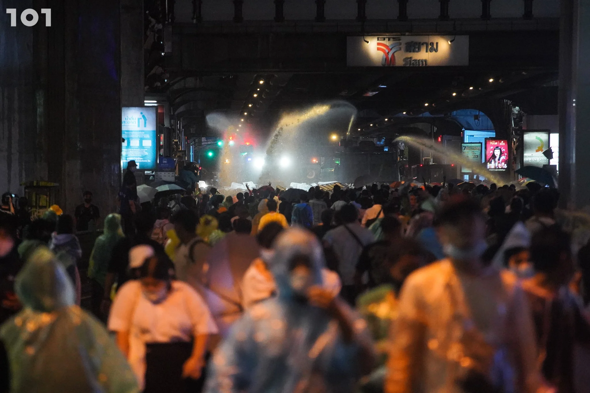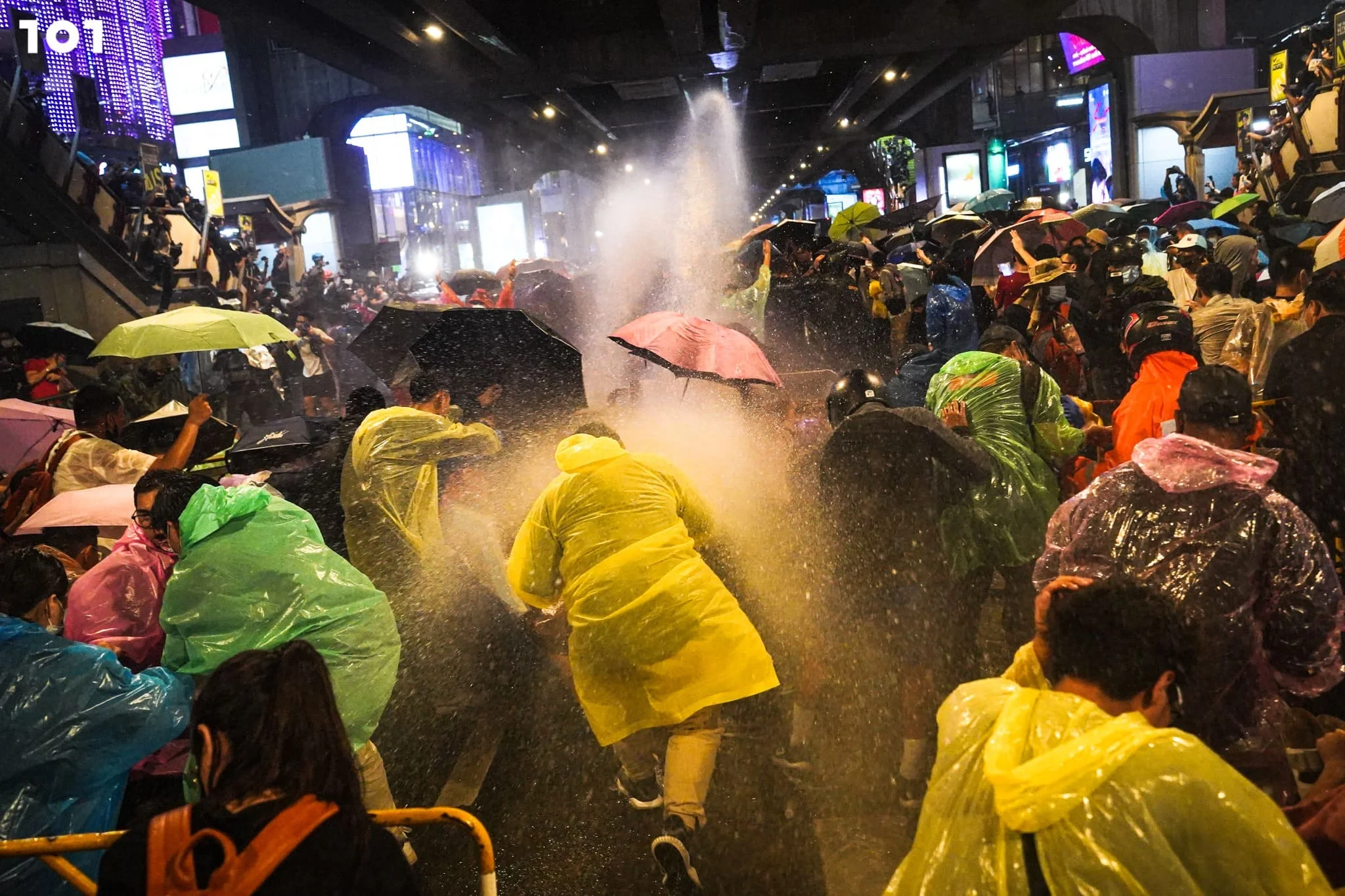 เวลา 18.30 น. เจ้าหน้าที่ตำรวจพร้อมรถควบคุมฝูงชนได้เคลื่อนมาบริเวณใต้รถไฟฟ้าบีทีเอสสถานีสยาม โดยมีการฉีดน้ำแรงดันสูง น้ำผสมแก๊สน้ำตา และน้ำผสมสีฟ้าใส่ผู้ชุมนุม สลับกับการปล่อยเสียงรบกวน และค่อยๆ มุ่งไปยังสี่แยกปทุมวันท่ามกลางความพยายามต่อต้านจากผู้ชุมนุมที่นำสิ่งของมาขวางกั้นรถฉีดน้ำแรงดันสูง