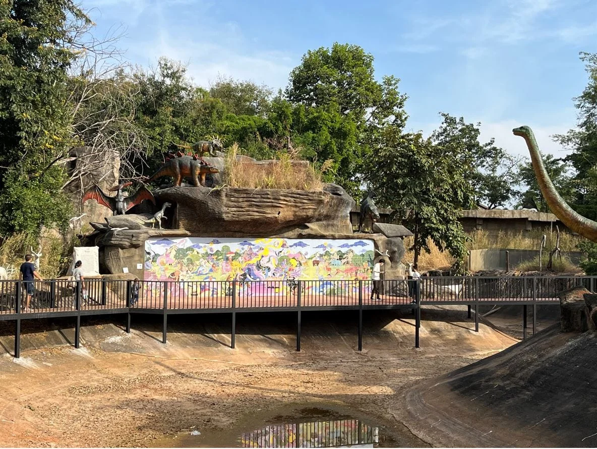 มันว่างานชิ้นนี้แหละคือที่สุดที่มันได้ดูมาในเวลาสองวัน เป็นศิลปะติดตั้งจัดวางเฉพาะที่ (site specific installation) ซะด้วย สิ่งมีชีวิตทั้งจากโลกอดีตและปัจจุบันในภาพฝาผนังที่กระดุกกระดิกขึ้นมาได้เฉพาะใน AR ที่ตั้งอยู่ท่ามกลางรูปปั้นไดโนเสาร์ยืนรอบลำคลองแตกระแหงของสวนน้ำร้าง ชวนให้ wonder สุดๆ ว่ามันจะมีไหมวันที่ ‘วิวัฒนาการ’ จะมาถึง? (ไดโนเสาร์ที่นี่เป็นรูปปั้น ไม่ใช่ฟอสซิล อันนั้นต้องไปดูที่พิพิธภัณฑ์ไม้กลายเป็นหิน ซึ่งมีผลงาน ซ้อมเป็นแมมมอธ (The Mammoth Rehearsal Sessions) ให้ผู้ชมเข้าร่วมกิจกรรมสะกดจิตเพื่อกลายร่างเป็นแมมมอธที่สูญพันธุ์ไปแล้วด้วยล่ะ พวกเด็กน้อยที่มากับมันก็ได้ไปเล่นกันสนุกสนานอยู่)