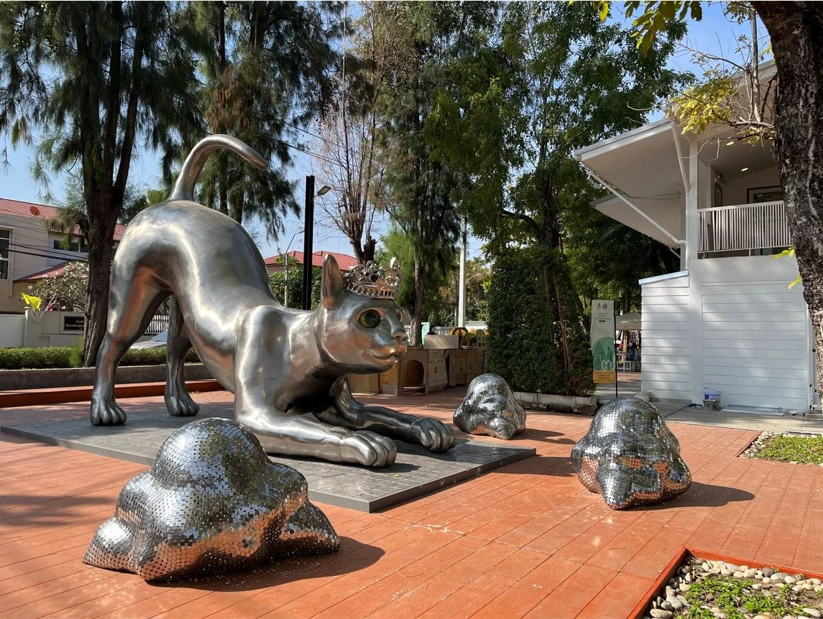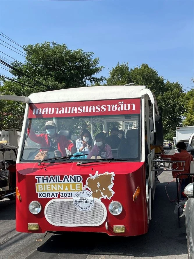 แต่มีอยู่จุดนึงที่รถรางของเทศบาลนคร นครราชสีมาพาวิ่งดูงานคือบริเวณรอบคูเมือง มันออกจะชอบเจ้าสิ่งนี้อยู่มาก ไม่ใช่แค่เพราะความสะดวก แต่เพราะเห็นในเอนเนอจี้ของคนทำงานระดับปฏิบัติการในท้องถิ่นที่กระตือรือร้นกับการเรียกผู้คนขึ้นรถ แล้วเล่าเรื่องประวัติศาสตร์เมืองโคราชสลับกับจอดให้ลงไปดูงานศิลปะตามจุดต่างๆ มันหวนนึกถึงเสียงหัวเราะเยาะของพวกคนฉลาดๆ พวกหัวก้าวหน้าทั้งในทางการเมืองและศิลปวัฒนธรรมเมื่อเดือนที่แล้วตอนที่ทางจังหวัดปล่อยคลิป “เชิญเที่ยวงานมหกรรมศิลปะนานาชาติ Thailand Biennale Korat 2021” ออกมา คลิปที่มีข้าราชการในชุดผ้าไหมมายืนเรียงแถวกันหน้าผลงานชิ้นนั้นชิ้นนี้ (สะท้อนความเอาหน้าของราชการแบบไทยๆ เหรอ? ก็คงใช่ แต่ก็ไม่ได้มีแต่ข้าราชการสักหน่อยที่ชอบถ่ายรูปเอาหน้า) โบกไม้โบกมือ วิ่งลอดใต้ท้อง แมวนางงาม (Queen Cat) ของกฤช งามสมคลิปนั้นนั่นแหละ คอมเมนต์ล้อเลียนประเภท “จักรพรรดินียูโกะเห็นคลิปนี้หรือยังนะ” หรือ “โอ๊ย โอลาเฟอร์ เอเลียสสันจะว่าอย่างไร” สะท้อนมุมมองที่มันเคยได้ยินจากการจัดงานศิลปะร่วมสมัยในอีสานในวาระอื่น เมื่อศิลปินจากกรุงเทพเอ่ยออกมาว่า “พวกเขาไม่รู้ว่าเกิดอะไรขึ้นที่เบอร์ลินหรือนิวยอร์ก” ในทำนองเดียวกัน บางคนไม่ได้บ่นชื่อธีมภาษาไทย “เซิ้ง…สิน ถิ่นย่าโม” เพราะว่าความหมายไม่ตรงกับชื่อธีมภาษาอังกฤษ “Butterfly Frolicking on the Mud: Engendering Sensible Capital” แต่บ่นเพราะมันไม่ intellectual เท่า