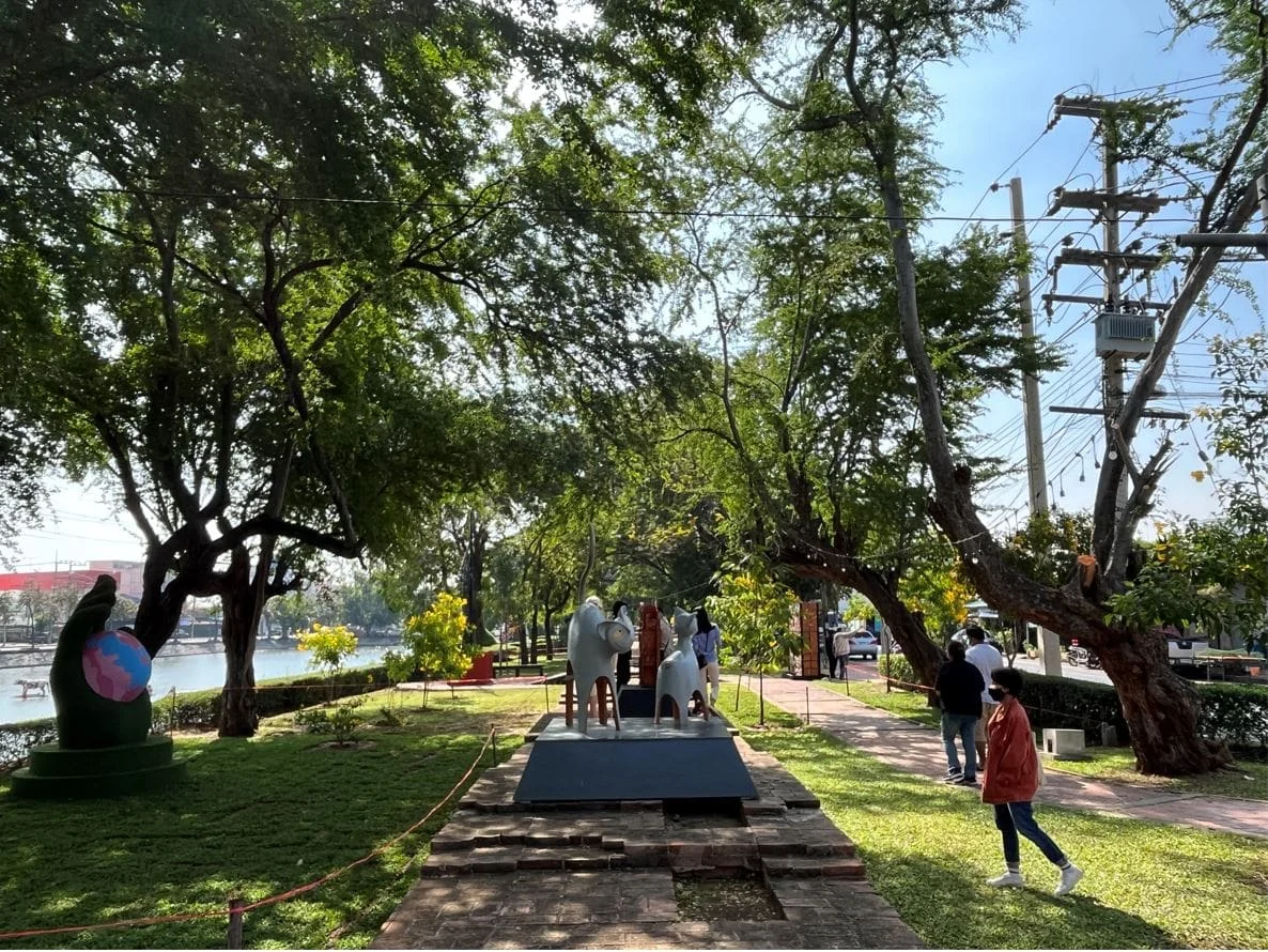 ไทยแลนด์ เบียนนาเล่ ประกอบด้วยพื้นที่จัดแสดงหลายส่วนที่ได้รับการอธิบายว่าเป็น ‘ทุนเชิงสถาบัน‘ (institutional capital) ได้แก่ โรงพยาบาล มหาวิทยาลัย วัด พิพิธภัณฑ์ สวนสัตว์ สวนสาธารณะ ชุมชนเครื่องปั้นดินเผาหรือทอผ้าไหม มันก็เป็นปกติอะนะที่เทศกาลศิลปะสเกลใหญ่จะจัดพื้นที่แบบกระจายทั่วเมือง (ก็งาน ‘ใหญ่’ มากหนิ แล้วอยู่ที่เดียวก็ไม่ได้ เดี๋ยวไปเข้าล็อกคำว่า ‘รวมศูนย์’ ซึ่งไม่เก๋อย่างที่สุด)