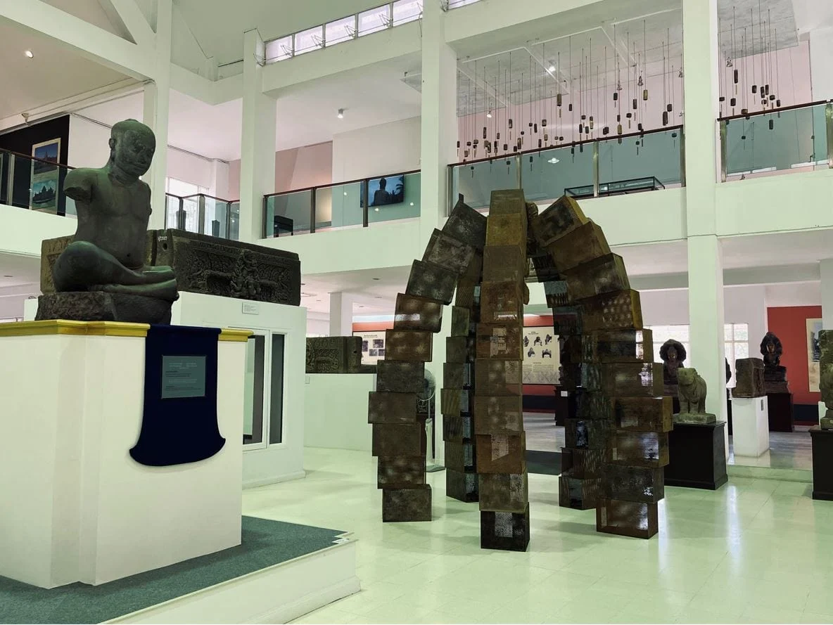 Nature’s Breast’s Arokayasala มีลักษณะเป็นสถูปที่ประกอบขึ้นจากกล่องโลหะโปร่งภายในบรรจุสมุนไพร เรียงทับซ้อนกันขึ้นไปจากฐานสู่ยอดตามระบบเดียวกับการเรียงหินสร้างปราสาทขอม ข้างในมีรูปปอดหล่อโลหะเคลือบสมุนไพรเชื่อมติดกันเป็นพวง การติดตั้งงานชิ้นนี้ในดงแรงบันดาลใจของมันช่วยให้ความเชื่อมโยงระหว่างศิลปกรรมอันเป็นโบราณวัตถุกับศิลปะร่วมสมัยชัดเจนขึ้น ในเมื่อทั้งคู่ต่างเป็นวัตถุจัดแสดงในพิพิธภัณฑ์ ก็ชวนให้จินตนาการต่อไปได้ว่า ผลงาน “ศิลปะร่วมสมัย” นั้นจะกลายสภาพเป็น “โบราณวัตถุ” ในกาลข้างหน้า มันไม่ต่างกันนักหรอกระหว่างรูปเคารพอย่างประติมากรรมพระเจ้าชัยวรมันที่ 7 กับผลงานศิลปะอโรคยาศาลาของมณเฑียรที่ตั้งอยู่ข้างๆ กัน เมื่อปราศจากเวทมนต์ของภาษาและพิธีกรรม วัตถุก็เป็นแค่วัตถุที่สร้างขึ้นจากวัสดุพื้นฐานอย่างอิฐ หิน ดิน ทราย เหล็ก และไม้ เป็นแค่วัตถุแห่งการจัดแสดงให้นักท่องเที่ยวไปเดินดูโดยไม่ต้องกราบไหว้ (มิติเชิงพิธีกรรมของพิพิธภัณฑ์เป็นอีกเรื่องหนึ่งที่มันจะยังไม่ชวนถกในที่นี้)