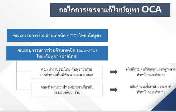 สิ่งที่รัฐบาลใหม่ของไทยจะต้องพิจารณาอีกประการหนึ่งคือ องค์ประกอบของคณะกรรมการด้านเทคนิคฝ่ายไทย ซึ่งรัฐบาลประยุทธ์ จันทร์โอชา ได้มอบหมายให้ประวิตร วงษ์สุวรรณ รองนายกรัฐมนตรีฝ่ายความมั่นคงเป็นประธาน ที่ผ่านมาคณะกรรมการชุดนี้ยังไม่ได้ทำอะไรมากไปกว่าจัดทำกรอบการเจรจากับกัมพูชาและตั้งคณะทำงานสองชุด คือชุดที่ว่าด้วยการแบ่งเขตทางทะเลมีอธิบดีกรมสนธิสัญญาและกฎหมาย กระทรวงการต่างประเทศ เป็นหัวหน้า และอีกชุดหนึ่งว่าด้วยระบอบการพัฒนาร่วม มีอธิบดีกรมเชื้อเพลิงธรรมชาติ กระทรวงพลังงาน กรอบการเจรจาที่รัฐบาลชุดที่แล้วกำหนดเอาไว้นั้น ไม่ได้เจาะจงอะไรเป็นพิเศษ กล่าวไว้เพียงว่า จะเจรจากันตามบันทึกความเข้าใจปี 2544 เพื่อให้เกิดประโยชน์สูงสุดแก่ไทยทุกด้าน เพื่อรักษาสิทธิของไทยตามกฎหมายระหว่างประเทศและบันทึกความเข้าใจที่ทำกันเอาไว้