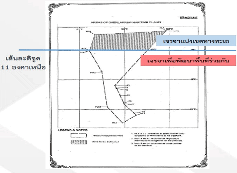 การเจรจาในช่วงระยะเวลาที่ผ่านมาให้ถือเอาเส้นละติจูด 11 องศาเหนือเป็นเส้นแบ่ง กล่าวคือให้ถือเอาพื้นที่ที่อยู่เหนือเส้นนี้เป็นบริเวณที่จะต้องมีการเจรจาเพื่อแบ่งทะเลอาณาเขต ไหล่ทวีป และเขตเศรษฐกิจจำเพาะ ส่วนพื้นที่ใต้เส้นนี้ลงมาให้จัดทำเป็นพื้นที่พัฒนาร่วมกัน แต่นั่นก็ยังไม่ใช่การแบ่งที่เบ็ดเสร็จเด็ดขาด