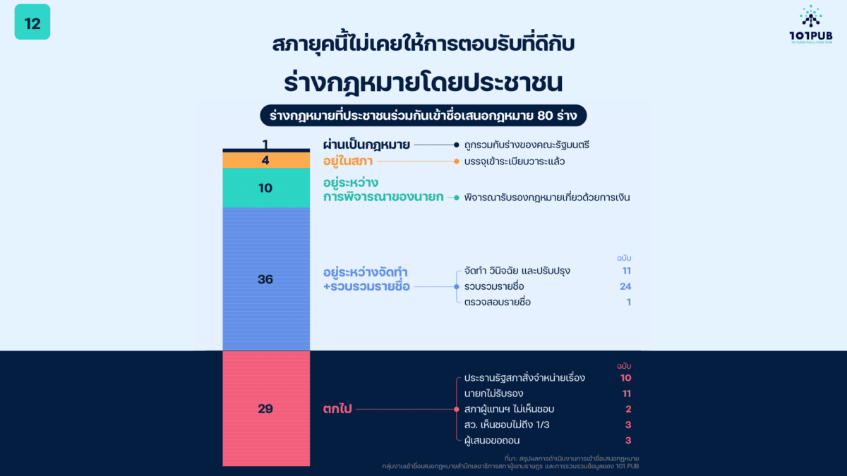 อย่างในช่วง 4 ปีที่ผ่านมา ประชาชนมีความกระตือรือร้นพยายามเข้าชื่อเสนอกฎหมายมากอย่างเป็นประวัติการณ์ถึง 80 ฉบับ ไม่ใช่แค่ปริมาณเท่านั้น แต่หลายฉบับยังมีคุณภาพดีด้วย เช่น พ.ร.บ.อากาศสะอาด พ.ร.บ.ยกเลิกคำสั่ง คสช. ไปจนถึงการแก้รัฐธรรมนูญให้ประเทศเป็นประชาธิปไตยมากขึ้น