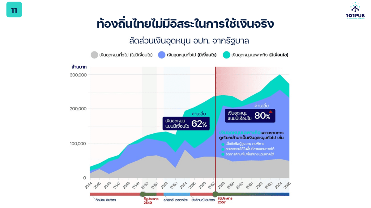 ท้องถิ่นไทยยังหารายได้เองไม่ได้ ต้องพึ่งพางบจากส่วนกลางถึง 90% ของรายได้ทั้งหมด โดยเป็นเงินอุดหนุนถึงครึ่งหนึ่ง แต่เงินอุดหนุนเหล่านี้ 80% มาพร้อมกับเงื่อนไข แปลว่ามันคือนโยบายของรัฐบาลกลาง แค่ผ่านงบไปเบิกจ่ายจากบัญชีของท้องถิ่นเท่านั้นเอง