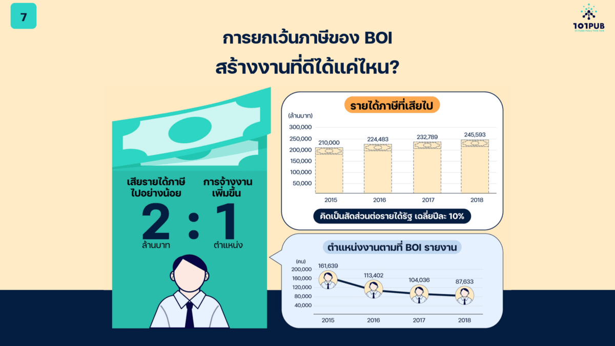 ที่ผ่านมา เราใช้เงินไปกับมาตรการ BOI กว่า 200,000 ล้านบาทต่อปี และมีแนวโน้มเพิ่มขึ้น แต่ตัวเลขซึ่ง BOI รายงานเองยังบอกว่าสร้างงานได้ไม่มากและสร้างได้น้อยลงเรื่อยๆ โดยเราต้องเสียรายได้ภาษีไป 2 ล้านบาท เพื่อสร้างงาน 1 ตำแหน่ง แถมยังเป็นงานที่ไม่ได้ใช้ทักษะสูง และไม่ค่อยก่อให้เกิดนวัตกรรมภายในประเทศอีกด้วย