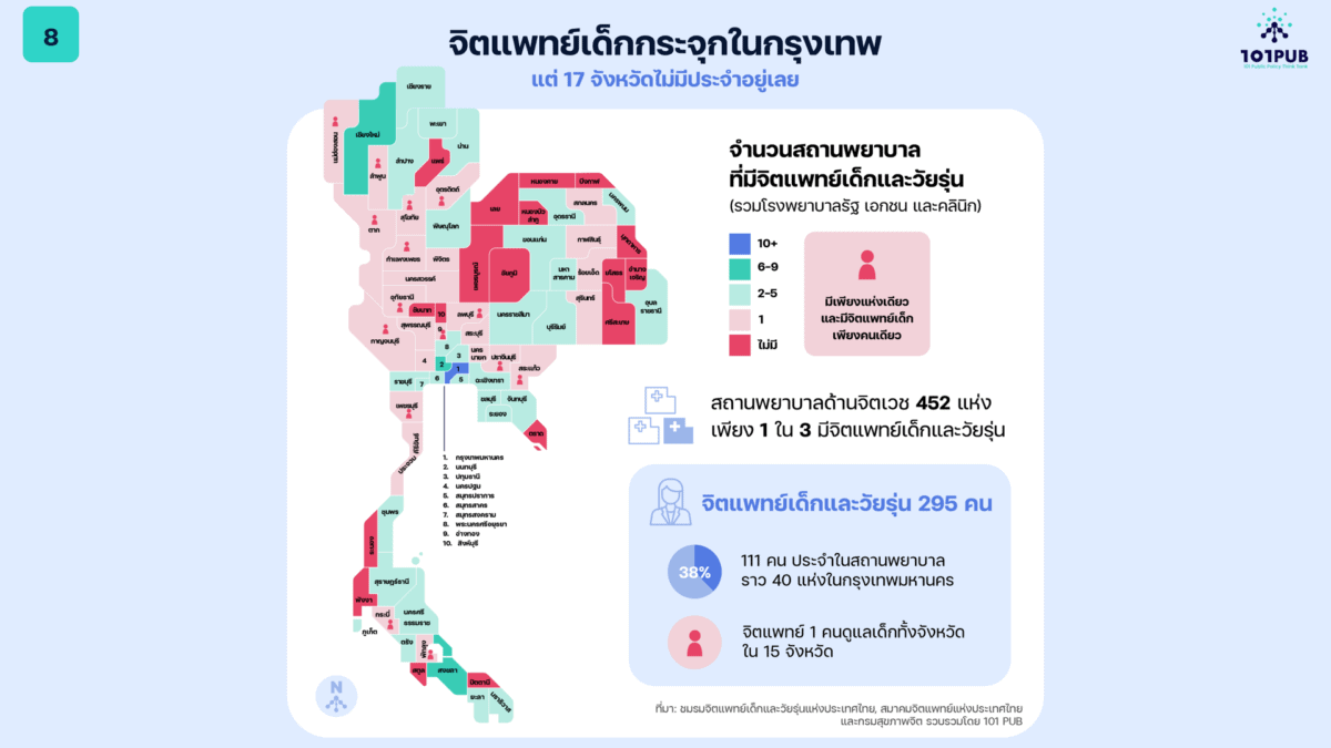 เราพบว่า เยาวชนไทย 62% มีความเครียดมากถึงมากที่สุด 51% รู้สึกเหงาและโดดเดี่ยว แต่ไทยยังขาดความพร้อมในการรับมือปัญหาสุขภาพใจอยู่มาก ทั้งประเทศมีสถานพยาบาลด้านจิตเวชเพียง 452 แห่ง โดยมีจิตแพทย์เด็กและวัยรุ่นประจำอยู่เพียง 1 ใน 3 ของจำนวนนี้ 17 จังหวัดไม่มีประจำอยู่เลย อีก 15 จังหวัด มีแค่ 1 คน