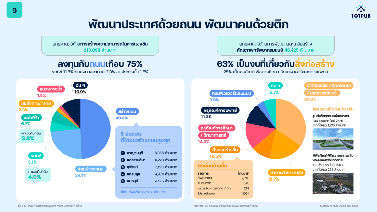 อย่างเช่นงบลงทุนของประเทศไทย 430,000 ล้านบาทต่อปี ยังวนเวียนกับการสร้างโครงสร้างพื้นฐานเดิมๆ งบลงทุนในยุทธศาสตร์สร้างขีดความสามารถในการแข่งขันของประเทศ 75% หมดไปกับการสร้างและซ่อมถนน งบลงทุนในยุทธศาสตร์พัฒนาทรัพยากรมนุษย์ 63% หมดไปกับการสร้างตึก จนพวกเราชอบแซวกันว่า ประเทศไทย ‘พัฒนาชาติด้วยถนน พัฒนาคนด้วยตึก’