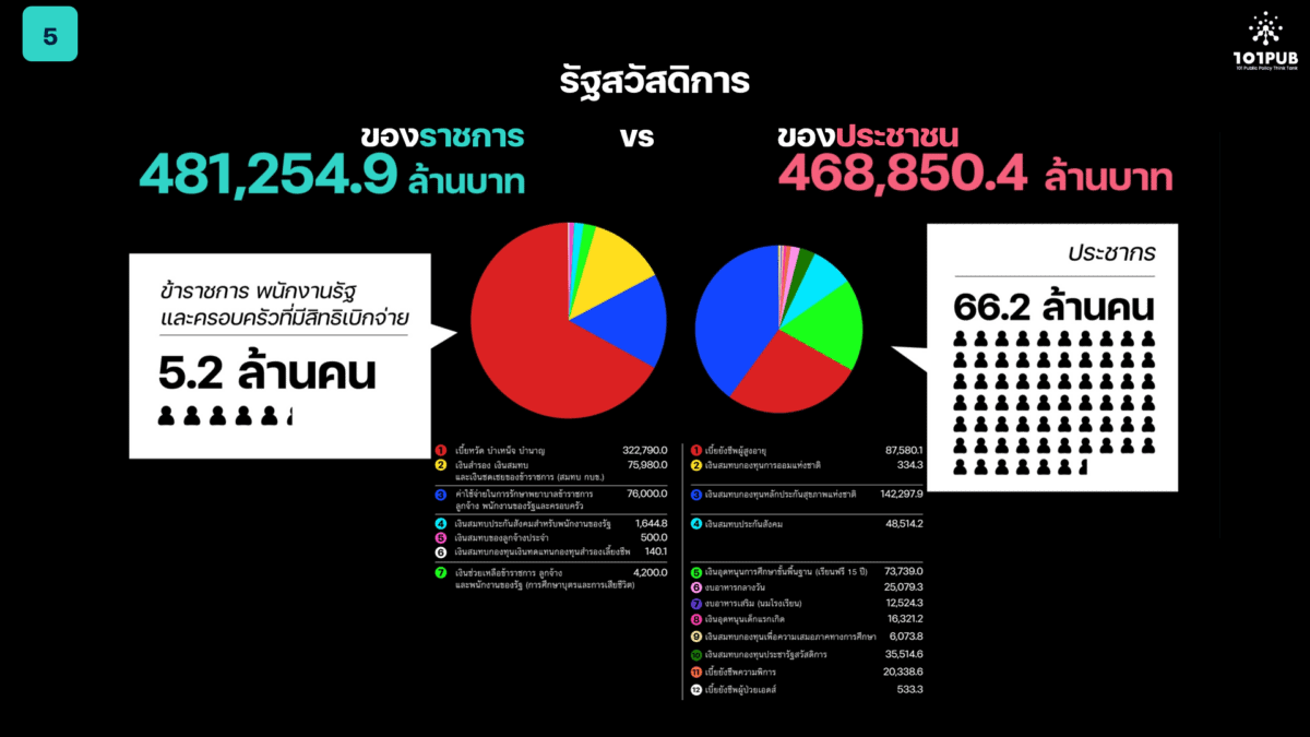 ที่จริงประเทศไทยมีรัฐสวัสดิการที่ดีแล้ว แต่เป็นรัฐสวัสดิการของราชการ ไม่ใช่รัฐสวัสดิการของประชาชน เราใช้งบประมาณ 4 แสนกว่าล้านในการดูแลคนราว 5 ล้านคน ทั้งข้าราชการปัจจุบัน สมาชิกครอบครัว และข้าราชการเกษียณ แล้วเราก็ใช้เงินพอๆ กันสำหรับสวัสดิการดูแลประชาชนทั้ง 66 ล้านคนทั่วประเทศ