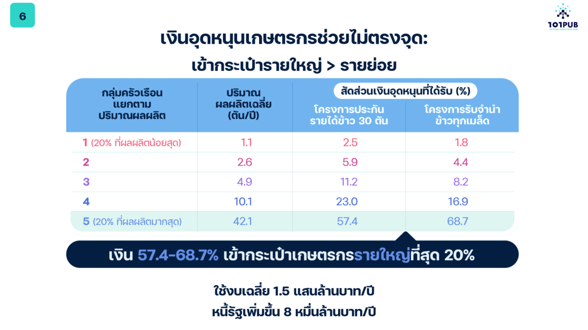 เงินอุดหนุนนี้ยังเป็นตัวหมุนวงจรปัญหาของเกษตรกร ให้ผลิตเหมือนเดิม ยากจนเหมือนเดิม เป็นหนี้เหมือนเดิม แล้วยังสร้างคำถามต่อความเป็นธรรมในการใช้เงิน เพราะไม่ใช่เกษตรกรทุกคนจะจน และคนจนทุกคนก็ไม่ได้เป็นเกษตรกร