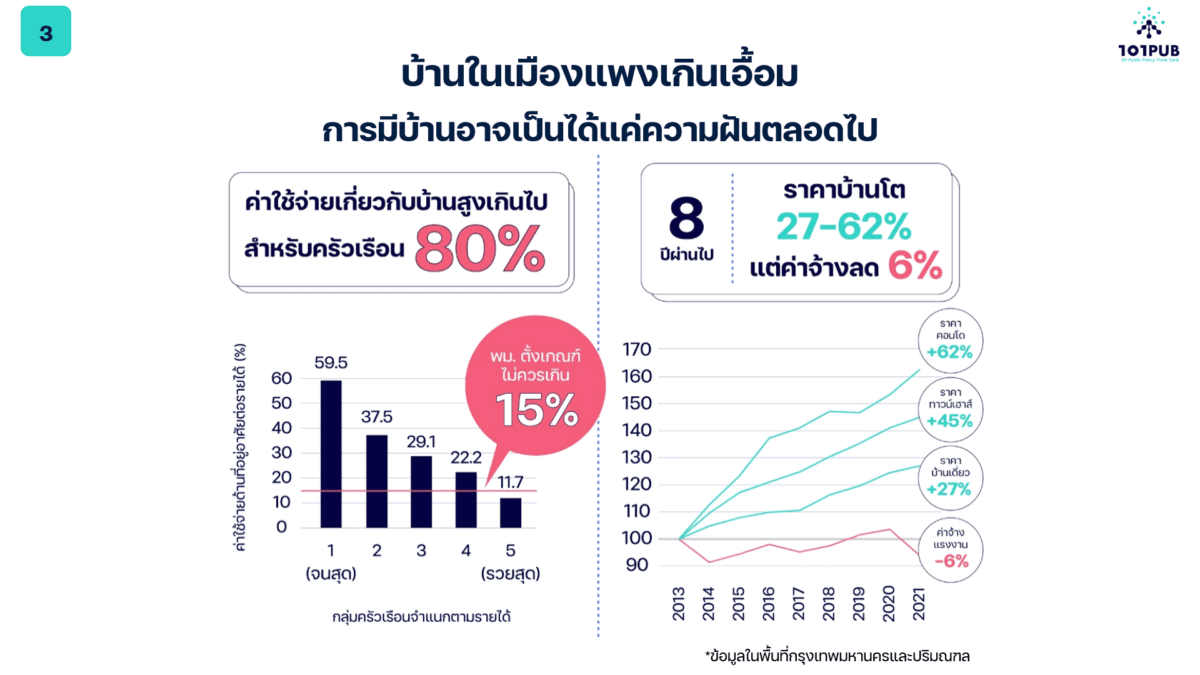 พม. เคยตั้งเกณฑ์ไว้เองว่า ค่าใช้จ่ายด้านที่อยู่อาศัยไม่ควรเกิน 15% ของรายได้ แต่ข้อมูลของ 101 PUB แสดงให้เห็นว่า ค่าใช้จ่ายเกี่ยวกับบ้านสูงเกินไปสำหรับคนเมือง 80%