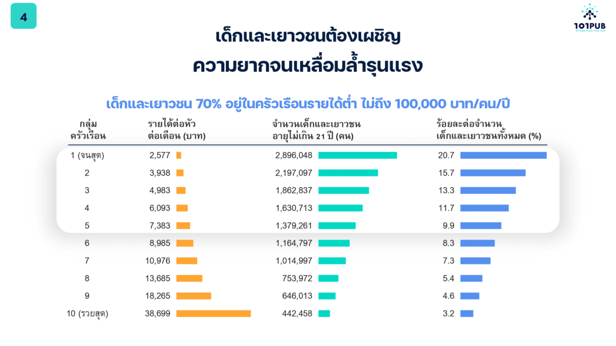 เมื่อผมนั่งทำข้อมูลพื้นฐานสำหรับการออกแบบนโยบายเด็ก เยาวชน และครอบครัวแห่งอนาคต ก็พบว่าเด็กและเยาวชนไทย 60% อยู่ในครัวเรือนที่มีรายได้ไม่พอจะส่งเขาเรียนจนจบปริญญาตรี เด็กและเยาวชนไทย 70% อยู่ในครัวเรือนที่มีรายได้เฉลี่ยไม่ถึง 100,000 บาท/คน/ปี ซึ่งเป็นเกณฑ์ได้รับบัตรสวัสดิการแห่งรัฐ นี่เรากำลังพูดถึงเด็กและเยาวชนราว 10 ล้านคนจาก 16 ล้านคน