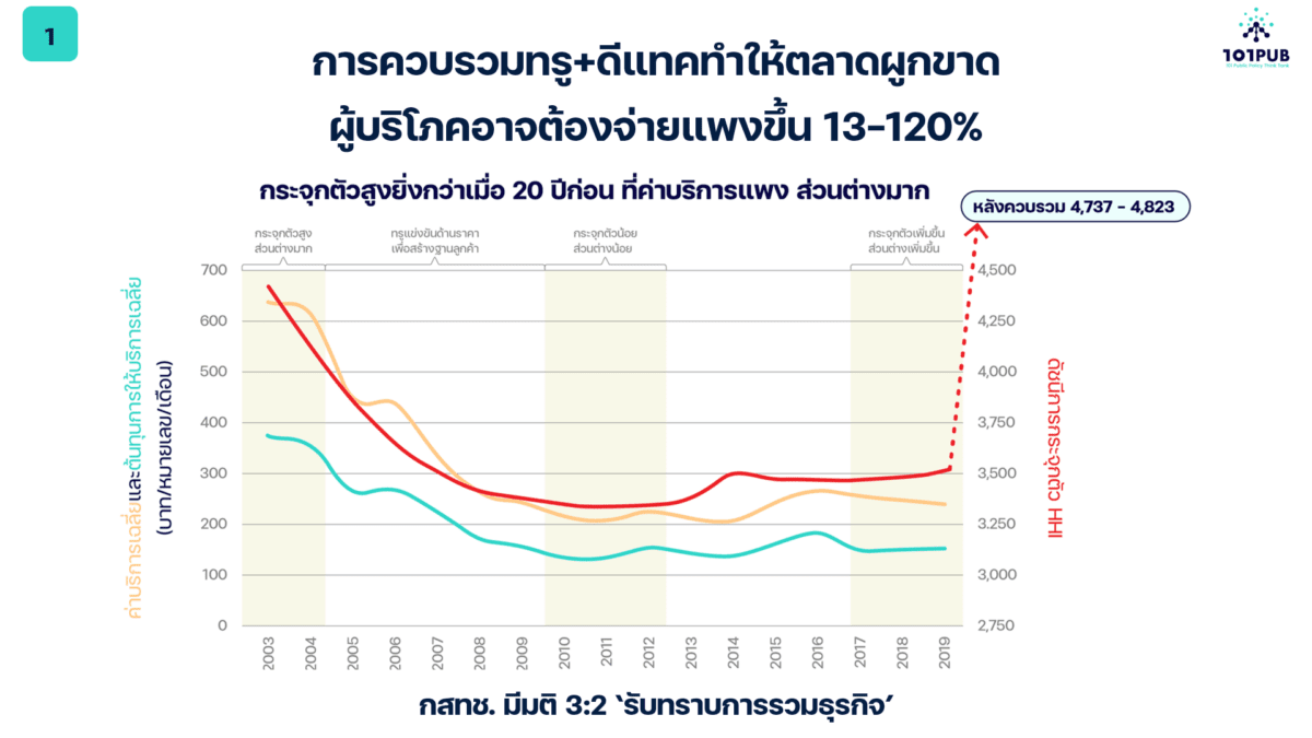 อย่างกรณีการควบรวมของทรูและดีแทค ซึ่งทำให้ตลาดโทรคมนาคมกระจุกตัวหนักขึ้น ผู้บริโภคก็ต้องแบกรับค่าใช้จ่ายสูงขึ้นมาก ในกรณีที่ควบรวมแล้วยังแข่งขันกันตามปกติ ค่าบริการก็ยังแพงขึ้น 13-23% ยิ่งถ้าควบรวมแล้วฮั้วกันสำเร็จ ค่าบริการอาจพุ่งสูงขึ้น 66-120%