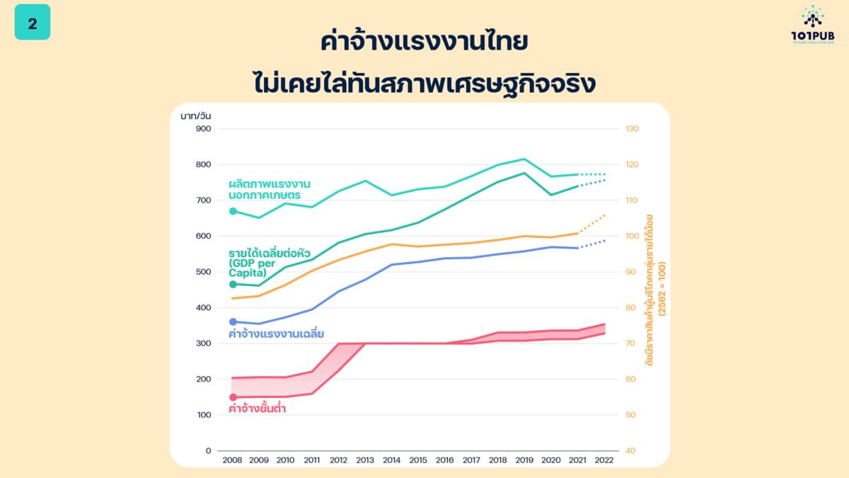 101 PUB เคยศึกษาการกำหนดค่าจ้างขั้นต่ำว่าสอดคล้องกับแนวคิดค่าจ้างเพื่อชีวิต (living wage) หรือไม่ แนวคิดนี้เป็นแนวคิดสากลว่าค่าจ้างควรทำให้แรงงานเลี้ยงดูตนเองและครอบครัวให้มีคุณภาพชีวิตที่ดีได้ ไม่ใช่เพียงประทังชีพคน 1 คนเหมือนในประกาศค่าจ้างขั้นต่ำไทย