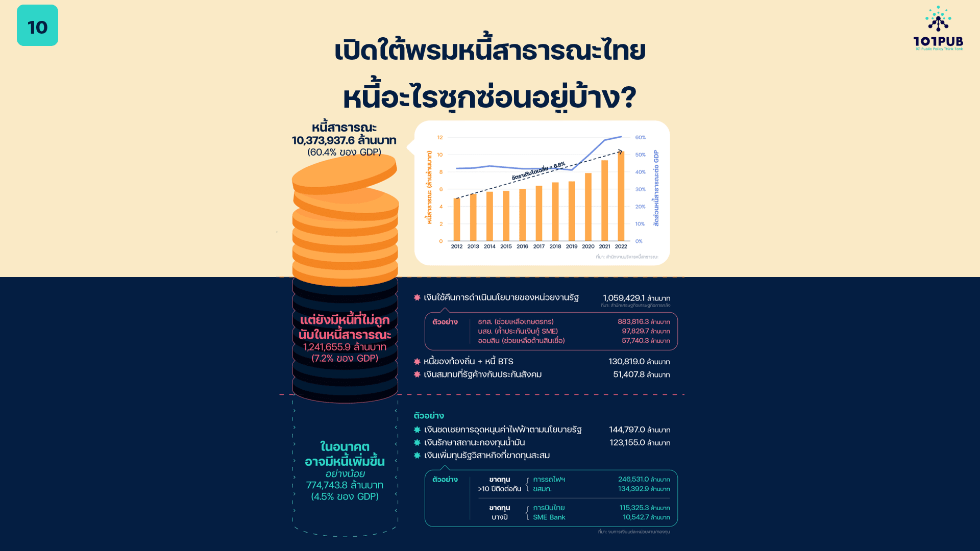 อย่างไรก็ดี ตัวเลขหนี้สาธารณะที่รายงานกันนี้ไม่ใช่ตัวเลขทั้งหมด 101 PUB ไปขุดดูหนี้ที่ซุกซ่อนอยู่ตามที่ต่างๆ พบว่ามีหนี้ใต้พรมที่ยังไม่ถูกนับ อย่างน้อยๆ อีก 1.2 ล้านล้านบาท และอาจกลายเป็น 2 ล้านล้านบาทในกรณีแย่ที่สุด หนี้เหล่านี้คือโซ่ตรวนฉุดรั้งขีดความสามารถของภาครัฐ ในการทำงานใหญ่ ในการพลิกโฉมประเทศไทย และจะเป็นภาระของประชาชนในท้ายที่สุด