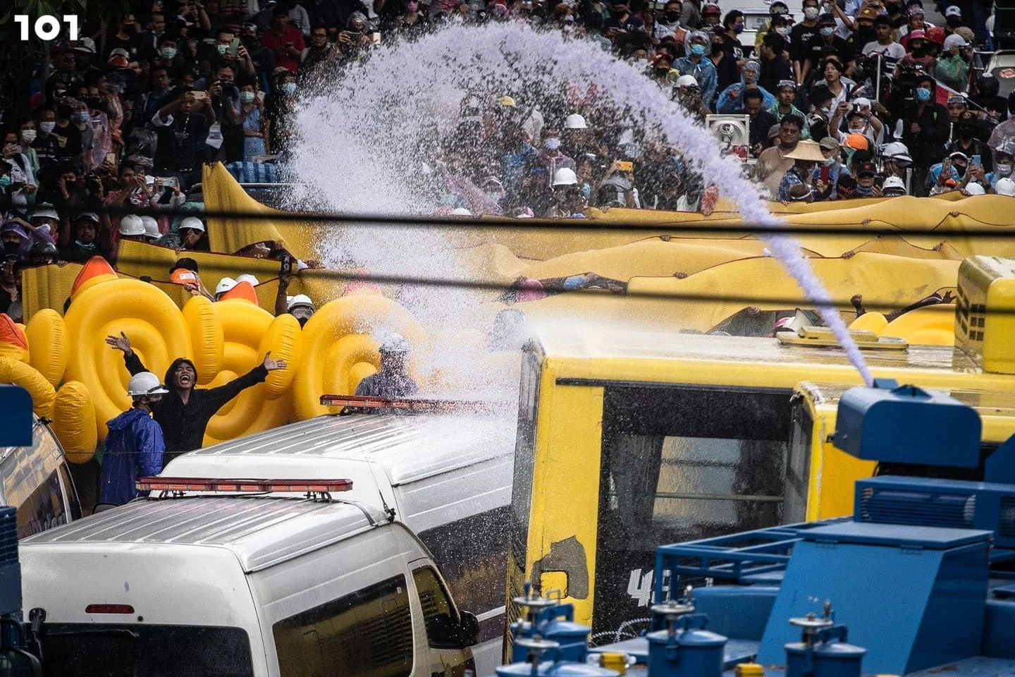 17 พฤศจิกายน 2563 ขณะที่ภายในรัฐสภากำลังพิจารณาลงมติต่อร่างแก้ไขรัฐธรรมนูญทั้ง 7 ฉบับ ภายนอกรัฐสภาเองตั้งแต่ ‘แยกเกียกกาย’ ทอดยาวไปถึงหน้า ‘บริษัทบุญรอดฯ’ ก็แน่นขนัดไปด้วยมวลชนที่ออกมาเรียกร้องให้มีการร่างรัฐธรรมนูญฉบับประชาชน ก่อนที่เหตุการณ์จะเริ่มชุลมุนขึ้น เมื่อเจ้าหน้าที่ตำรวจฉีดน้ำผสมสารเคมีใส่ผู้ชุมนุม โดยให้เหตุผลว่าพวกเขาพยายามรื้อรั้วลวดหนามและฝ่าแนวกั้นของตำรวจเพื่อเข้ามาบริเวณถนนหน้ารัฐสภา ผู้ชุมนุมและเจ้าหน้าที่โต้ตอบกันได้เพียงแค่ชั่วครู่ คำสั่งให้ใช้ ‘กระสุนยาง’ และ ‘แก๊สน้ำตา’ ก็ถูกประกาศขึ้น