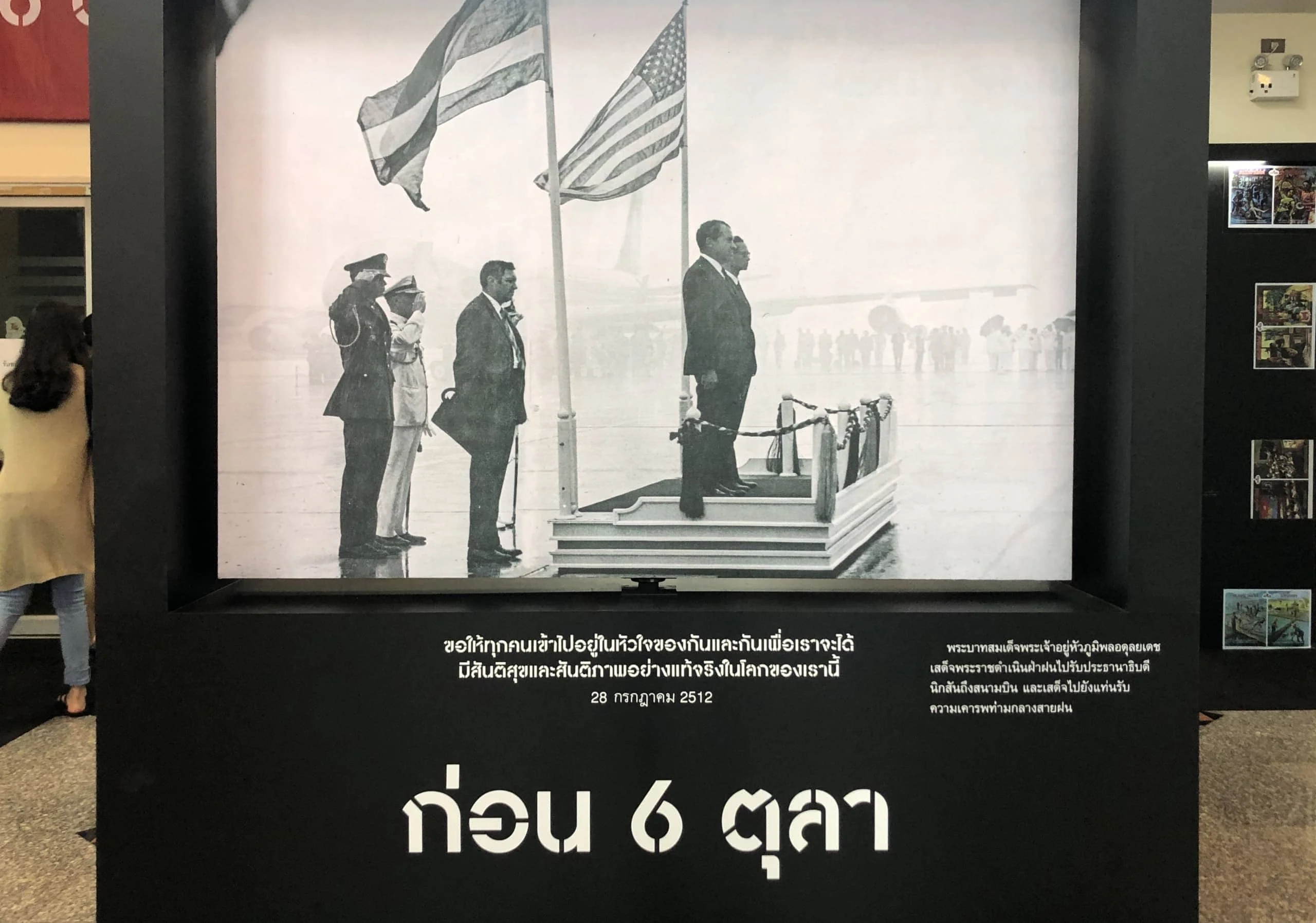 ผู้เขียนขอปิดท้ายด้วยภาพถ่ายภาพหนึ่งที่อยู่ในหัวข้อ “ก่อน 6 ตุลา” คำบรรยายภาพอธิบายว่านี่คือภาพตอนที่ “พระบาทสมเด็จพระเจ้าอยู่หัวภูมิพลอดุลยเดช เสด็จพระราชดำเนินฝ่าฝนไปรับประธานาธิบดีนิกสันถึงสนามบิน และเสด็จไปยังแท่นรับความเคารพท่ามกลางสายฝน” (ปี 2512) เหตุใดจึงต้องยืนท่ามกลางสายฝน? ภาพดังกล่าวบอกอะไรกับเรา? ภาพถ่ายจับจังหวะแห่งการ perform ของผู้ที่รู้ตัวว่ากล้องกำลังจับจ้อง สำหรับผู้เขียน ภาพนี้เผยให้สัมผัสบางมิติของเหตุการณ์ที่ยังคงแขวนลอยก้ำกึ่งอยู่ในบรรยากาศ นั่นคือความสัมพันธ์ระหว่างสถาบันกษัตริย์กับสหรัฐอเมริกาในยุคสงครามเย็นอันเป็นบริบทของเหตุการณ์ 6 ตุลา