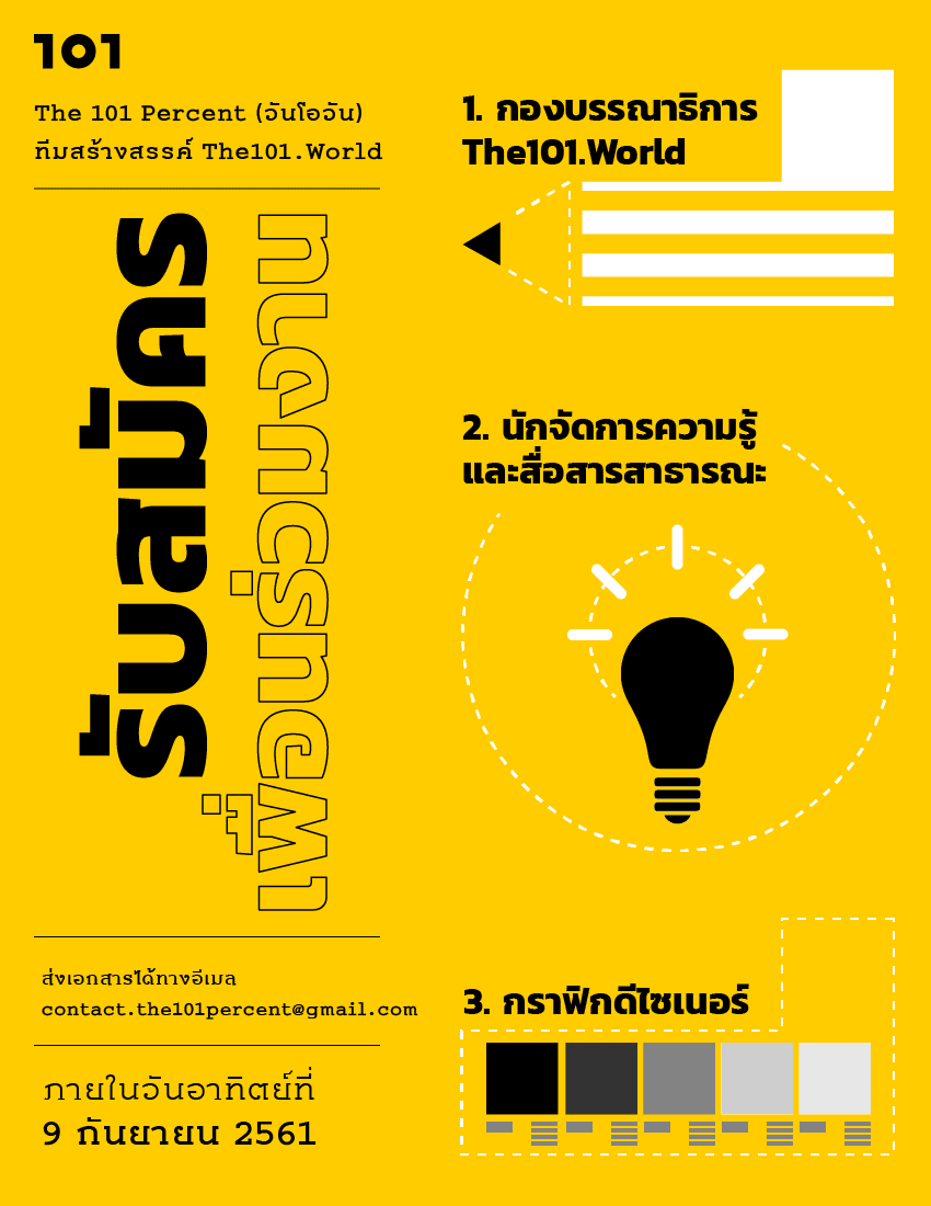 The 101 Percent (วันโอวัน) ทีมสร้างสรรค์ The101.world รับสมัครงานประจำ – (1) กอง บ.ก. The101.world (2) นักจัดการสื่อสารความรู้และสื่อสารสาธารณะ และ (3) กราฟิกดีไซเนอร์