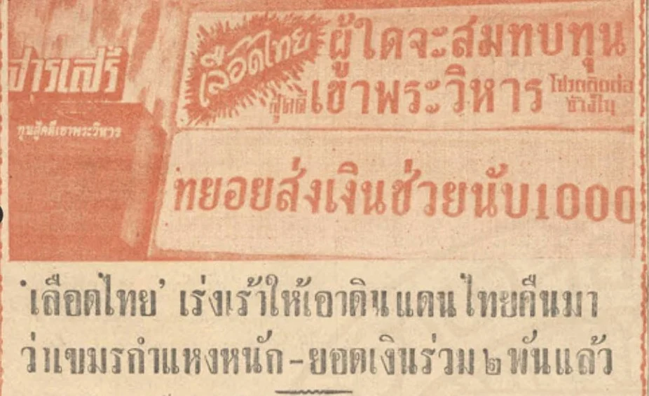 ตัวอย่างเช่น นายพร จิตรีขันธ์ ชาวจังหวัดธนบุรี แจ้งหนังสือพิมพ์สารเสรีว่า ด้วยความรักชาติและหวงสมบัติของชาติ ลูกสาวสองคนของตนพร้อมบริจาครถจักรยานสองล้อ “ให้รัฐบาลสู้คดีศาลโลกกับกัมพูชา”4 โดยหนังสือพิมพ์สารเสรี เขียนบรรยายว่า