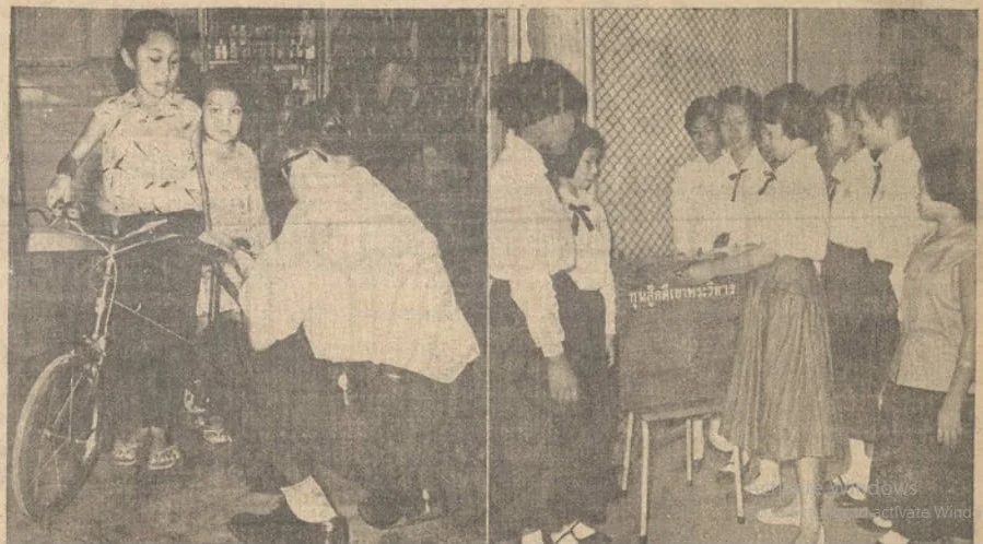 (ซ้าย) สองเด็กหญิงนำรถจักรยานสองล้ออันเป็นที่รักมาบริจาคให้แก่หนังสือพิมพ์สารเสรีเพื่อนำไปประมูลสบทบทุนสู้คดีเขาพระวิหาร