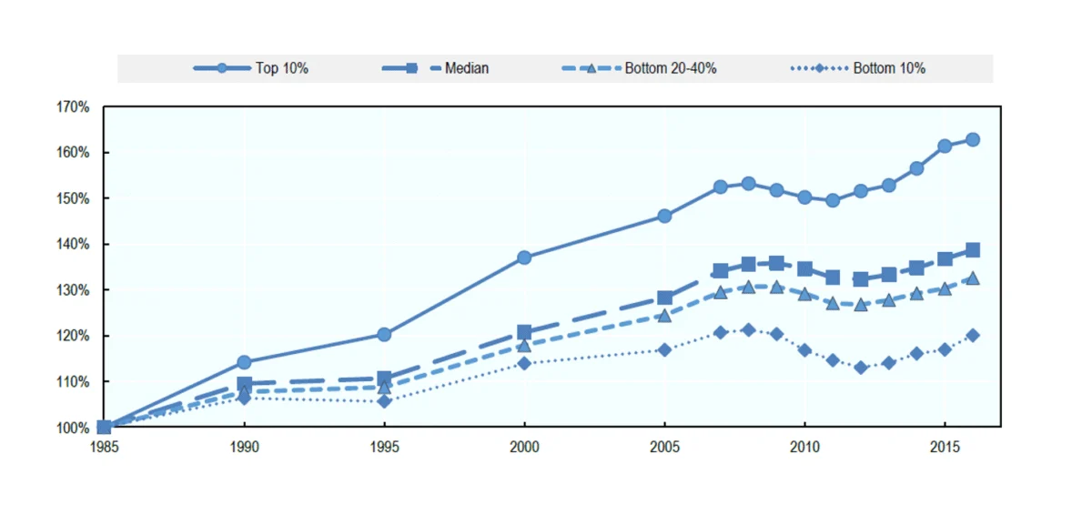 ในภาพรวม ชนชั้นกลางเติบโตช้ากว่าที่คาดหวัง แต่ก็ยังเติบโตได้เมื่อเทียบกับคนครึ่งล่างของสังคม
