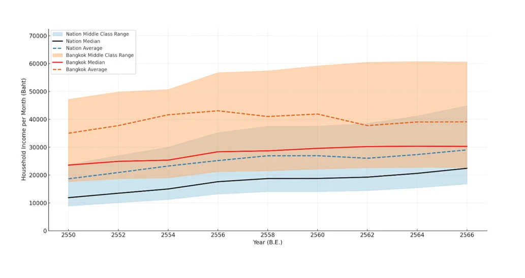 ถ้าใช้มาตรฐานเดียวกับ OECD ครอบครัวชนชั้นกลางไทยในปี 2566 ก็จะหมายถึงครอบครัวที่มีรายได้ประมาณ 16,800-44,800 บาทต่อเดือน โดยครอบครัวตรงกลางของประเทศมีรายได้ประมาณ 22,000 บาทต่อเดือน หรือถ้าเอาตัวเลขของครอบครัวในกรุงเทพฯ และปริมณฑลมาเทียบด้วย ฐานของครอบครัวชนชั้นกลางก็จะสูงขึ้นอีกหน่อยคือราวๆ 22,000-60,000 บาทต่อเดือน โดยครอบครัวตรงกลางในพื้นที่นี้มีรายได้เฉลี่ยต่อเดือนราวๆ 30,000 บาท