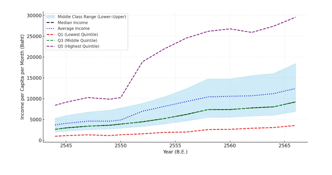 ถ้าข้อมูลของ OECD และสำนักงานสถิติแห่งชาติถูกต้อง อาจกล่าวได้ว่า ‘ชนชั้นกลาง’ บนฐานของรายได้ ซึ่งเป็นประชากรประมาณครึ่งหนึ่งของสังคมไทยก็น่าจะมีหน้าตาประมาณนี้